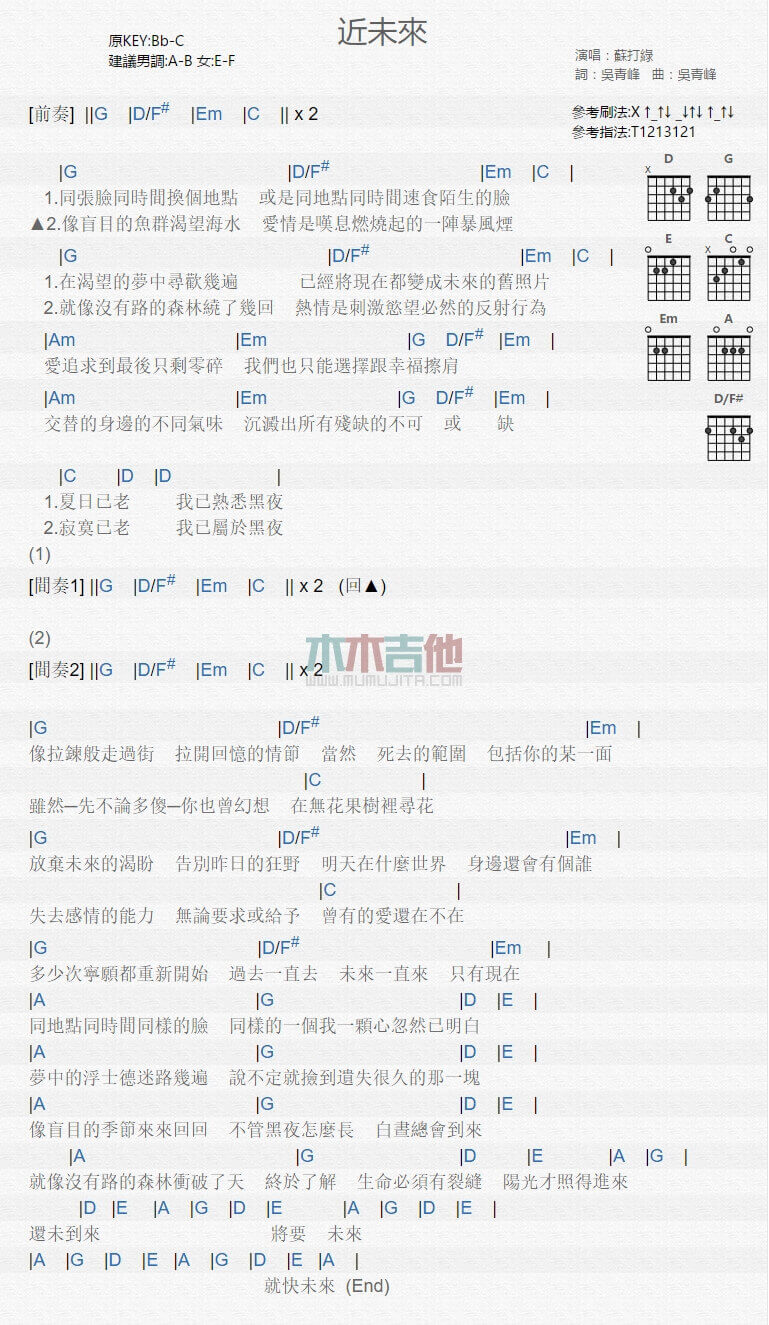 曲谱介绍: 近未来吉他谱采用了C调指法,由木木吉他编配完成。这首歌是苏打绿早期的一首歌,它蕴含了对过去,现在,未来三种状态的思考。重要提示:十指紧扣吉他谱更新啦,学完这首后,顺便把下首学了吧。