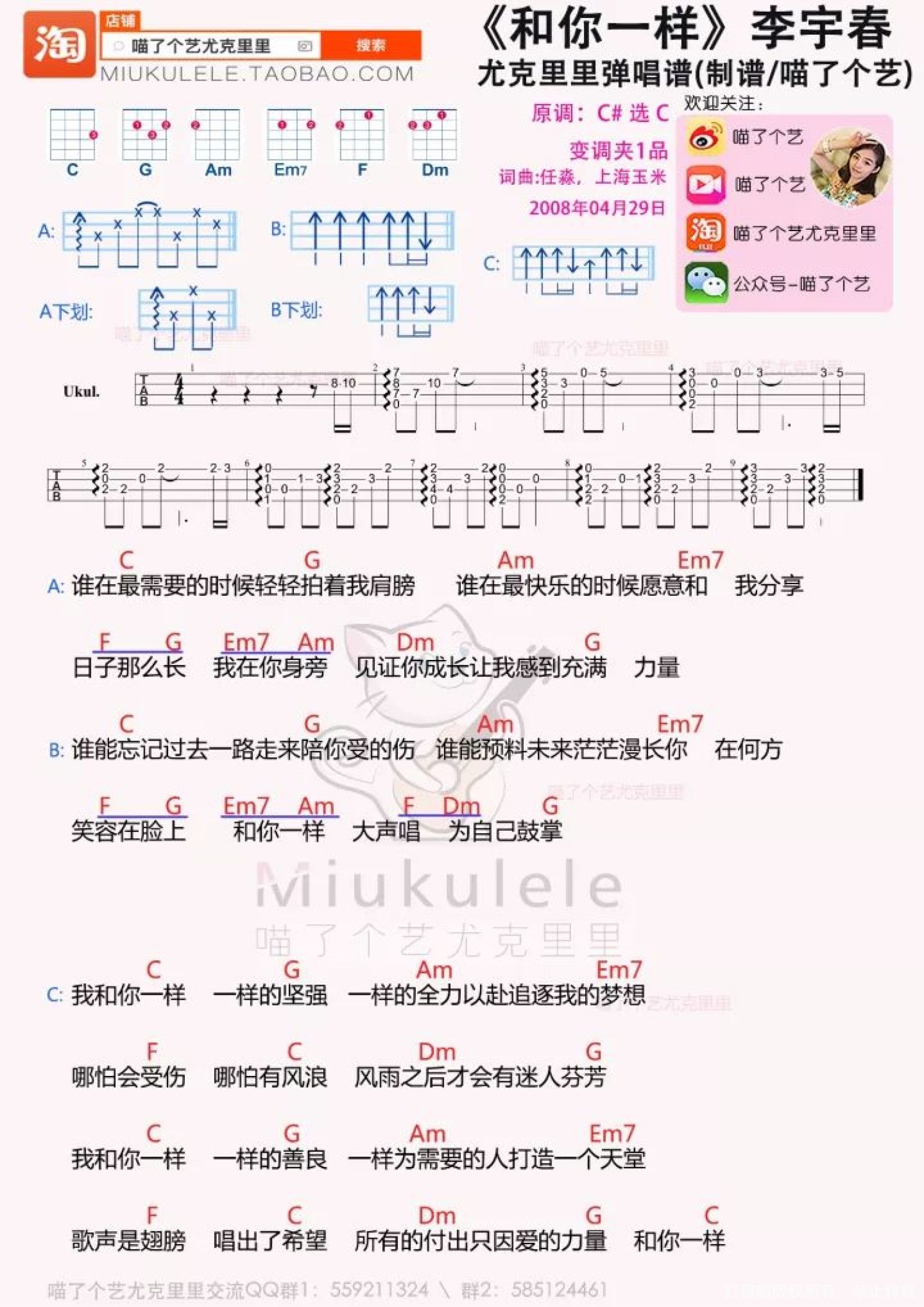 曲谱介绍: 这几天和很多人一样, 对好多新闻感到又愤怒又无力。 一边劝自己要理性等待真相, 一边又担心真相赢不了黑暗。 我们都害怕被伤害,心疼被伤害, 但是不管什么境地下, 都不要放弃对爱的相信和全力以赴的努力。   和你一样 尤克里里谱