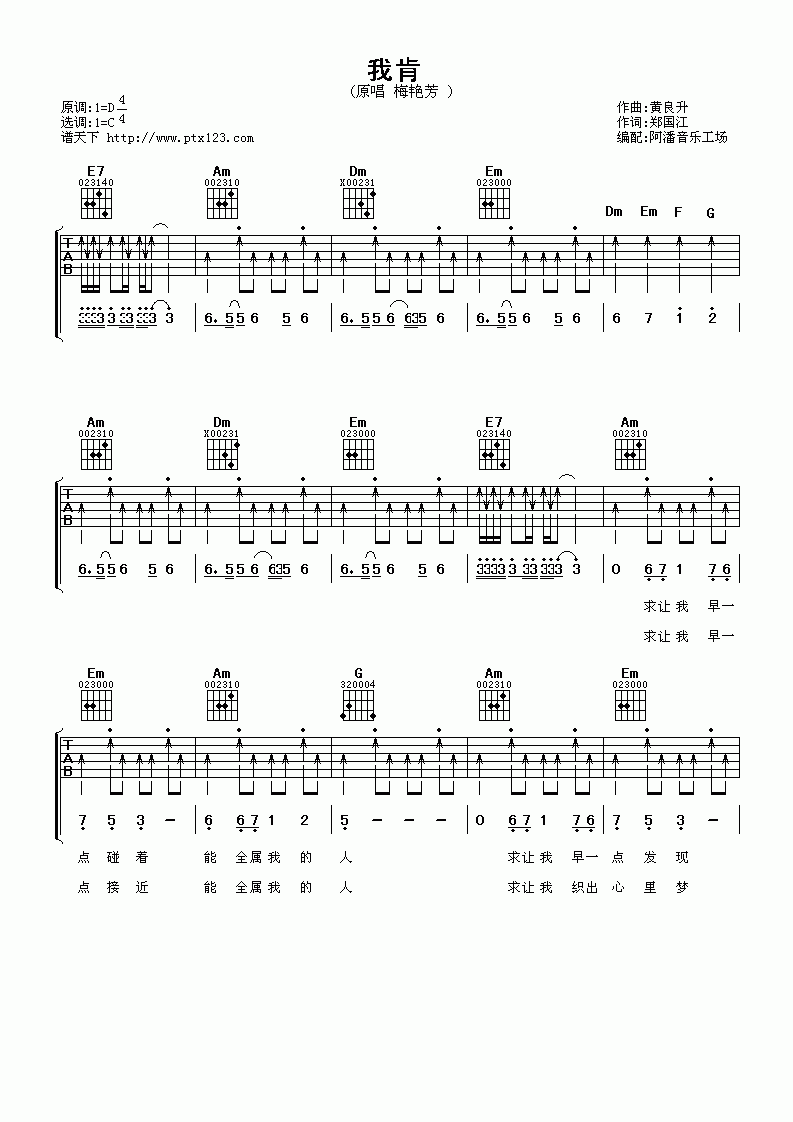曲谱介绍: 梅艳芳《我肯》吉他弹唱谱,共有3张高清图谱。