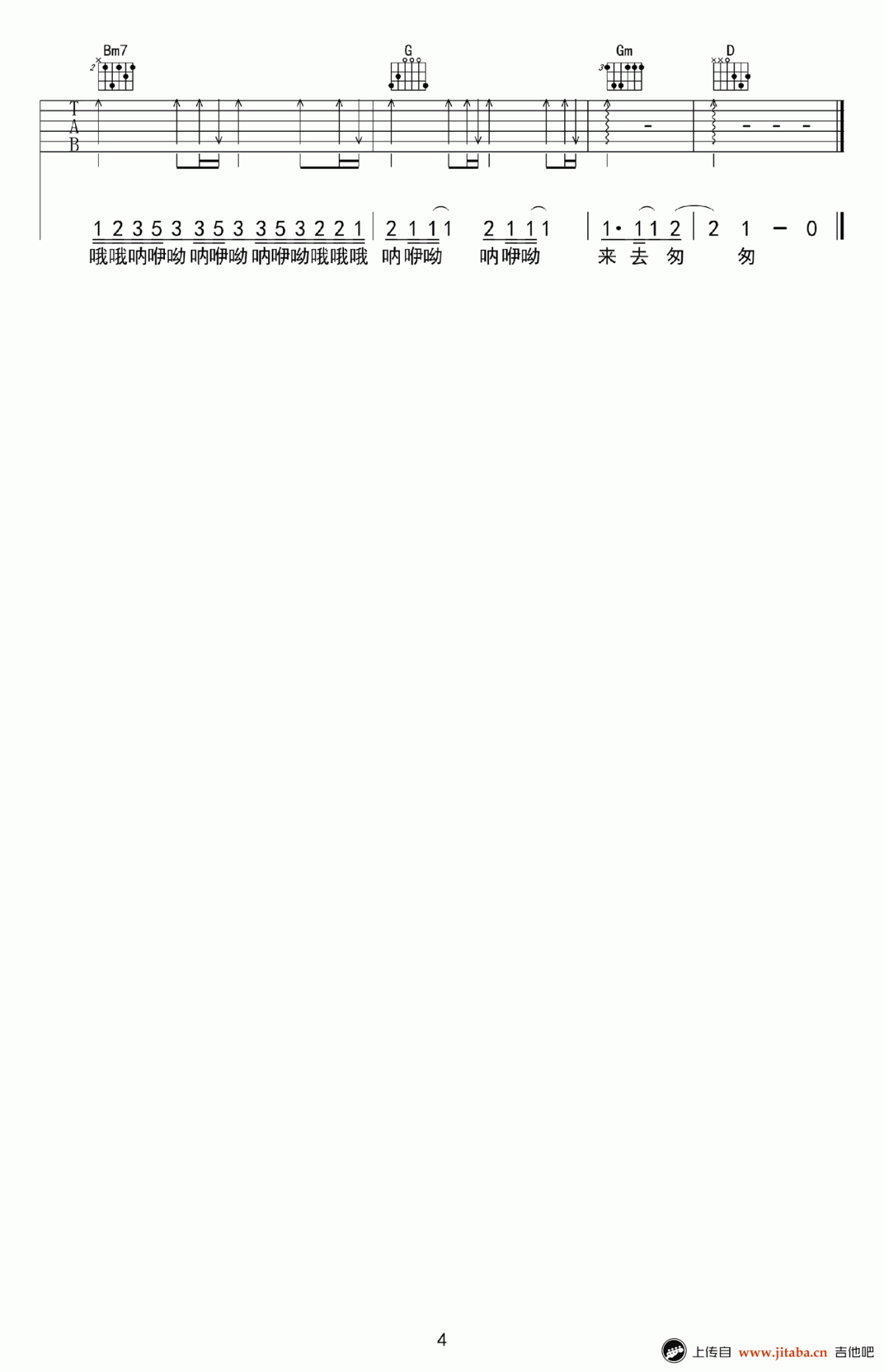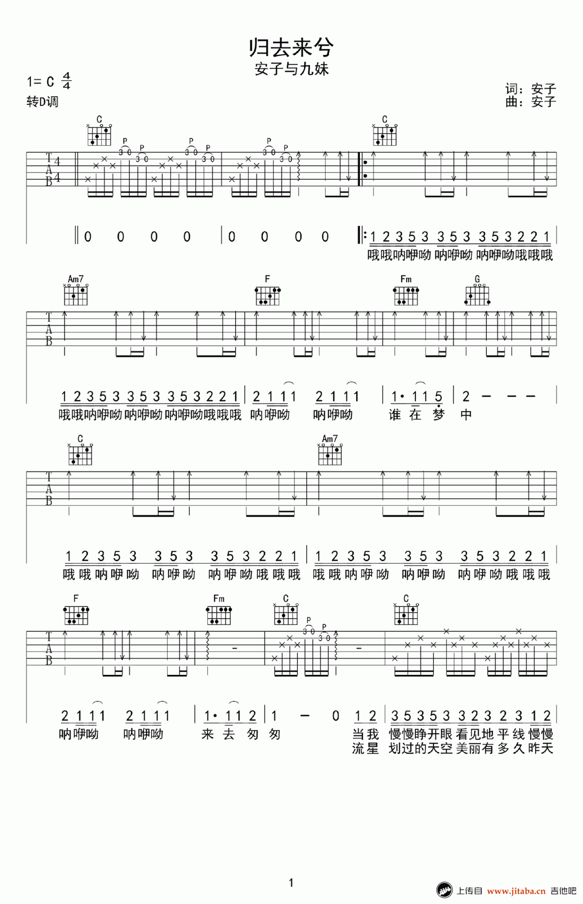 曲谱介绍: 安子与九妹《归去来兮》吉他弹唱谱,采用C调指法编配,共有4张高清图谱。