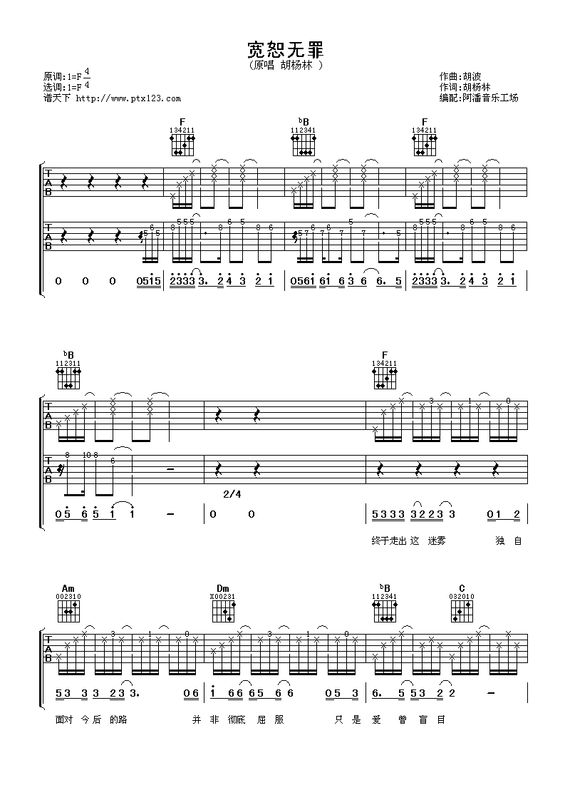 曲谱介绍: 宽恕无罪吉他谱采用了F调指法,由阿潘音乐工场编配完成。TIPS:在这里向大家推介另外一首,它就是心引力吉他谱啦,非常动听的一首曲子!