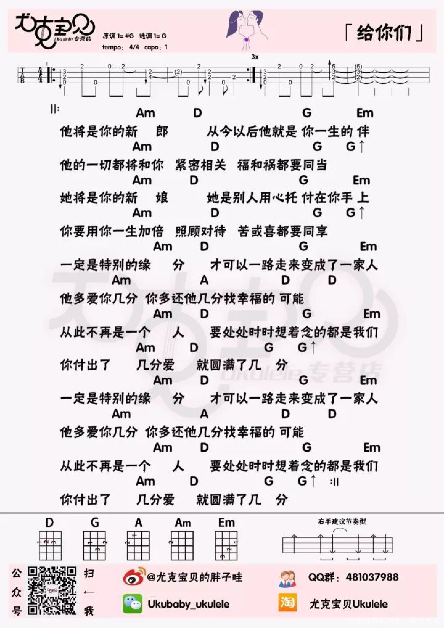 曲谱介绍: ●「给你们」来自张宇,由喜得制作,EMI发行,99年发行的《雨一直下》专辑中收录,词作者十一郎是张宇的老婆。 ● 这首歌,是张宇说以后要唱给自己女儿女婿的写的。 ● 这首歌歌词中表达的情感,在婚礼现场亮相率很高,是非常适合作为礼物送好朋友的歌。   “一定是特别的缘分, 才可以一路走来变成一家人。”   这样的句子,说出来,就让人感觉特别的暖心。(强烈建议离婚登记处单曲循环!)   「给你们」尤克里里弹唱曲谱