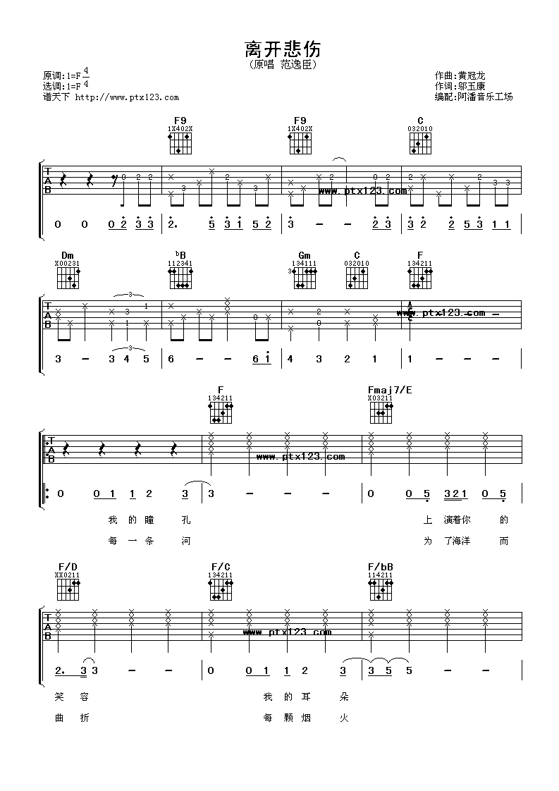 离开悲伤吉他谱 - 范逸臣 - F调吉他弹唱谱