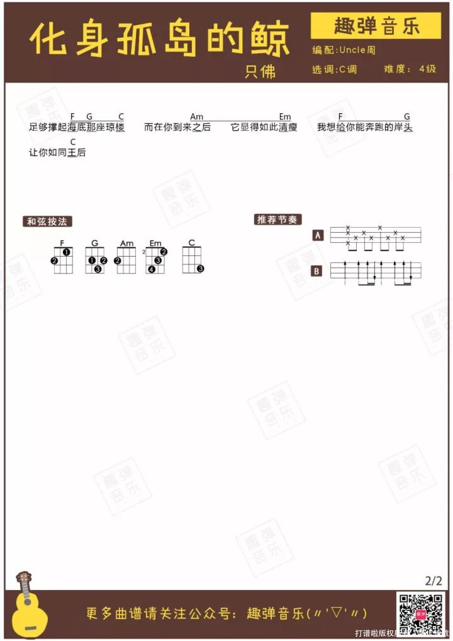 曲谱介绍: 如童话般温柔的一首歌,治愈每颗孤独的心   这首歌的前奏响起时,好像耳朵被浸泡在海水中,仿佛能够听见来自深海的神秘低吟。   我是只化身孤岛的蓝鲸,有着最巨大的身影。   在我们印象中,蓝鲸是庞大而神秘的,所以也是孤独的。《化身孤岛的鲸》唱的就是一只鲸的心声。   据说这首歌讲的是一个孤独的故事。 在茫茫大海里,有一只被命名为Alice的鲸,自1989年被科学家发现以来,它没有一个同伴。 常的鲸发出声音的频率在15~25赫兹,而Alice声音的频率却高达52赫兹。 因此Alice的歌声从未被听见,也从未被理睬,它一直孤独地生活在深海里。   即便这只如孤岛般寂寞的鲸孤独一生,它却没有以恶意报复这个世界。 “当鲸鱼在海洋中死去,它的尸体会慢慢沉入海底。 鲸鱼的尸体可以供养整套生命系统长达百年,这是它留给大海最后的温柔。”这种现象被称作鲸落。 相信每一个暂时感到孤独的人,都有一只默默守护你的蓝鲸,把最温柔的歌声留给你。   关于歌曲   ● 《化身孤岛的鲸》改编自香港歌手谢安琪演唱的歌曲《我们都被忘了》。 ● 由沃特艾文儿重新填词,只佛是这首填词版的原唱。   这首歌因为细腻优美的歌词和意境唯美的旋律,被许多人翻唱,在网络上红极一时。 很多网友联想到了著名动画大师宫崎骏的作品中所包含的温柔治愈的感觉。 周深在翻唱这首歌时,空灵缥缈的歌声与歌曲优美辽阔的意境完美融合,被称作是最美的翻唱版本之一。   周深翻唱   这样如童话一般温柔治愈的歌,用小U演绎一定深情动人得和海水一样吧。 一起来收谱弹唱吧♪   尤克里里谱
