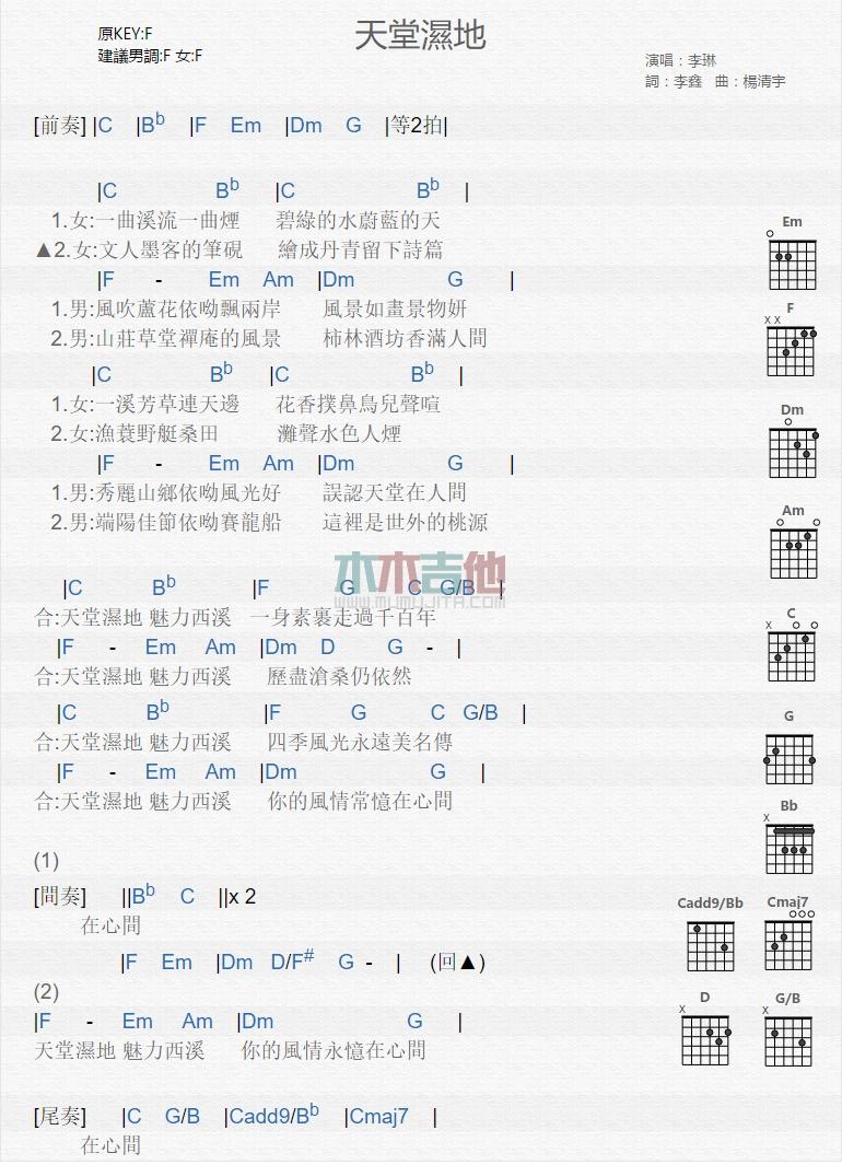 曲谱介绍: 天堂湿地《天堂湿地_》吉他弹唱谱,共有1张高清图谱,免翻页排版设计。