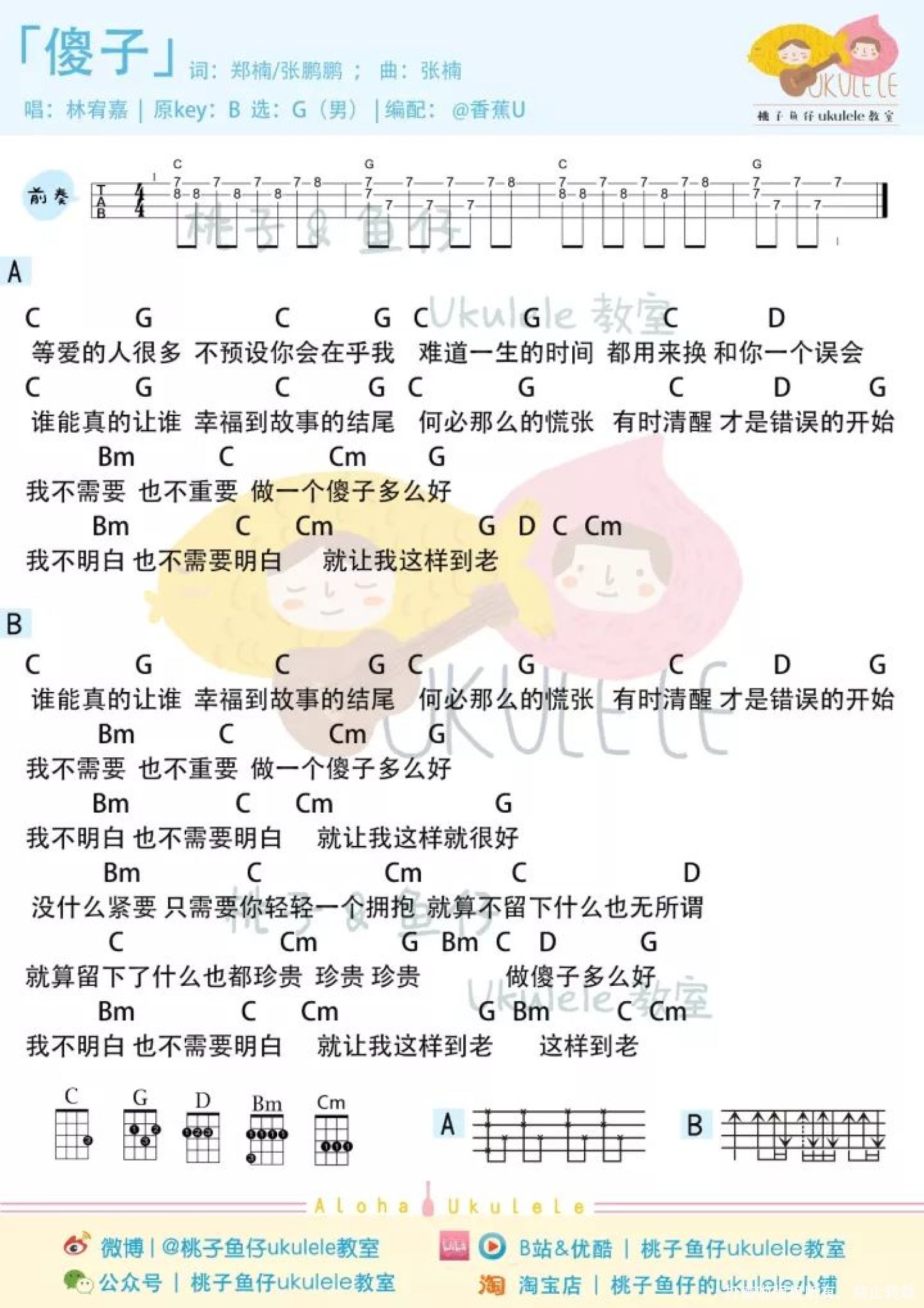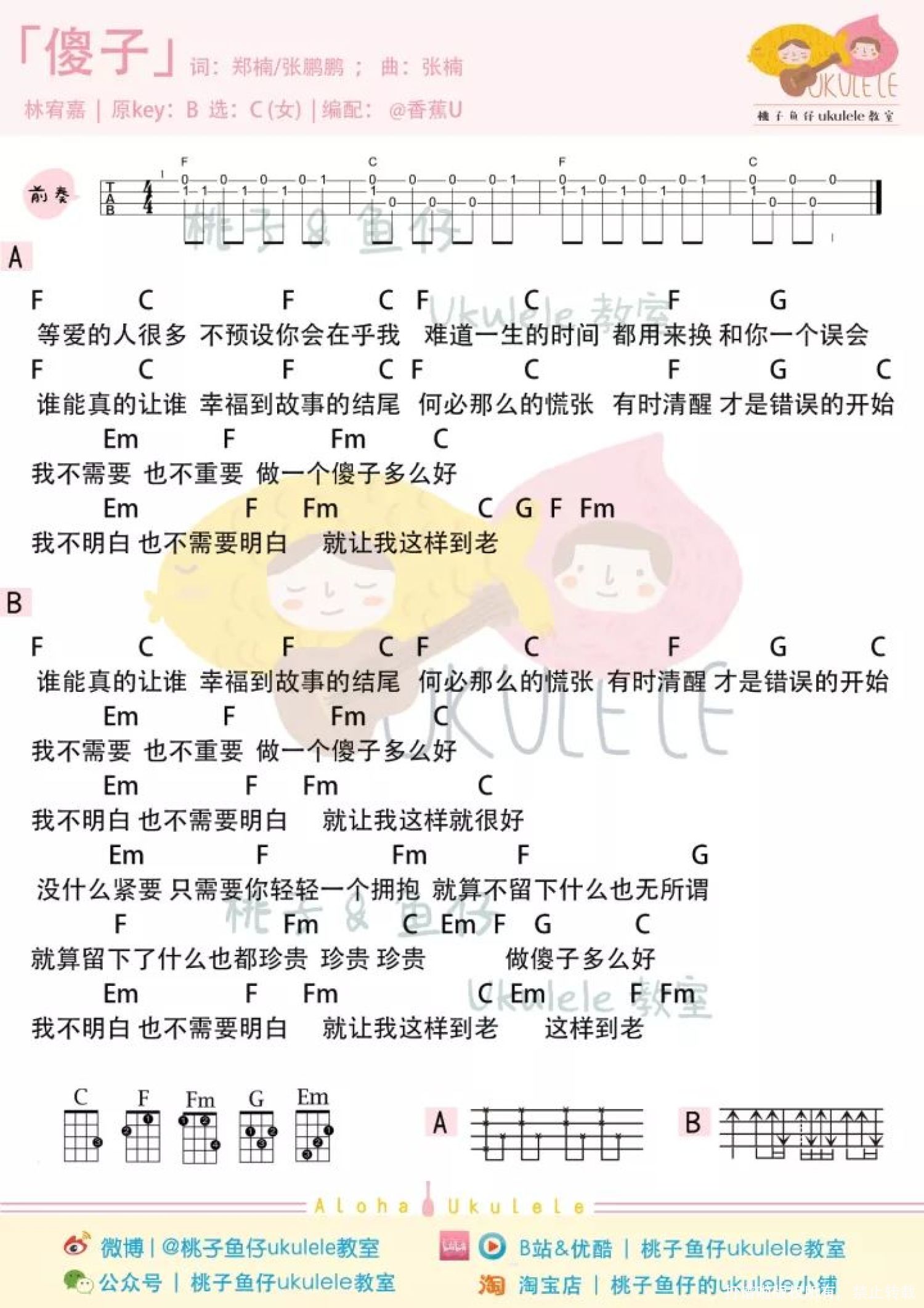 曲谱介绍: 「傻子」尤克里里弹唱谱 女声版 男声版