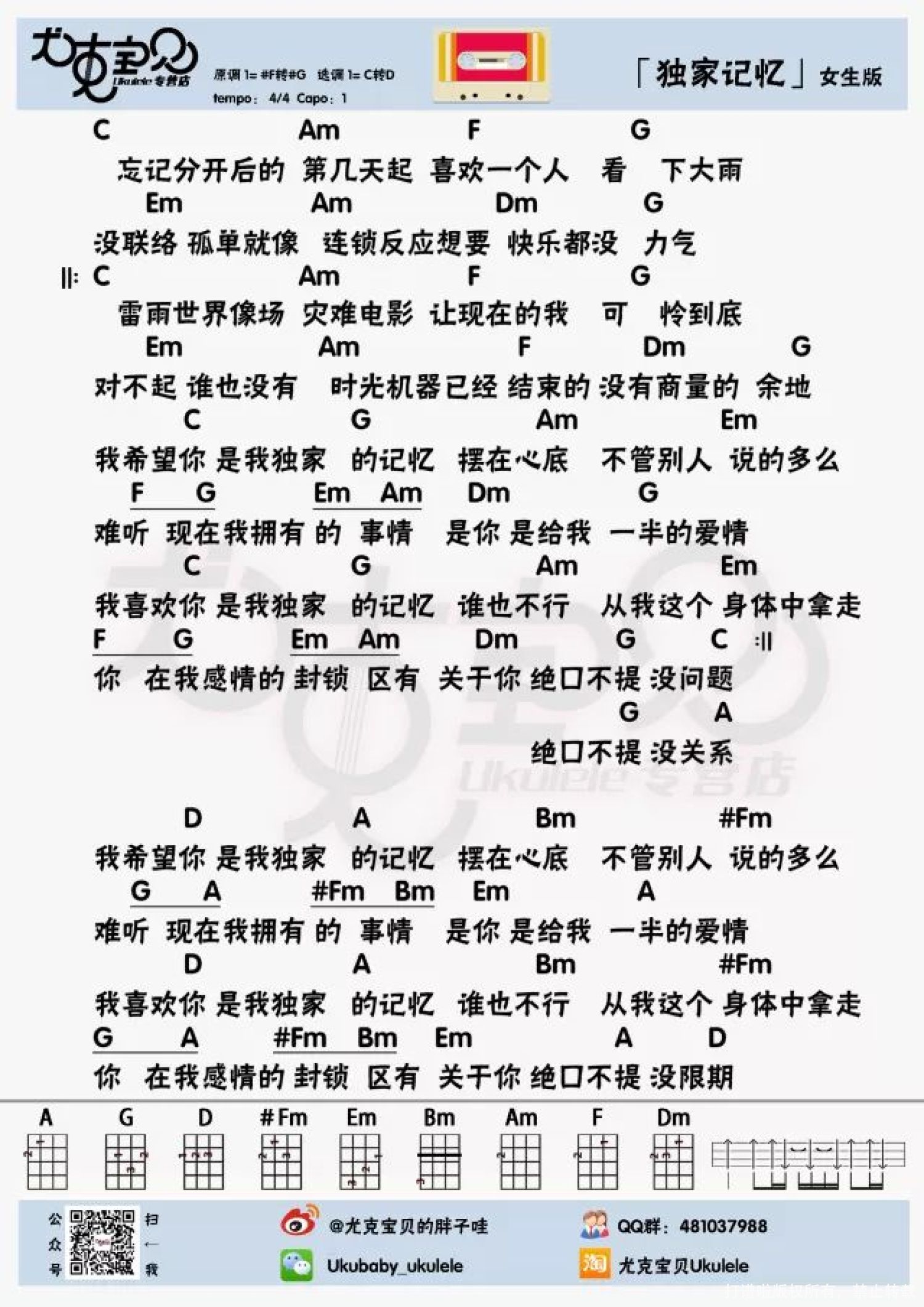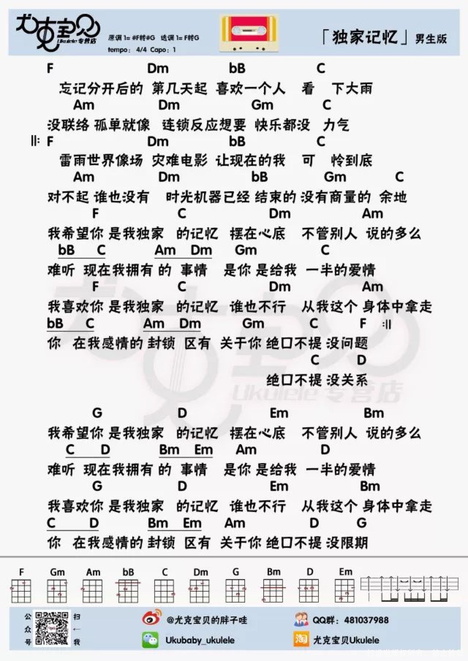 曲谱介绍: 「独家记忆」尤克里里谱 男声版F调 女声版C调