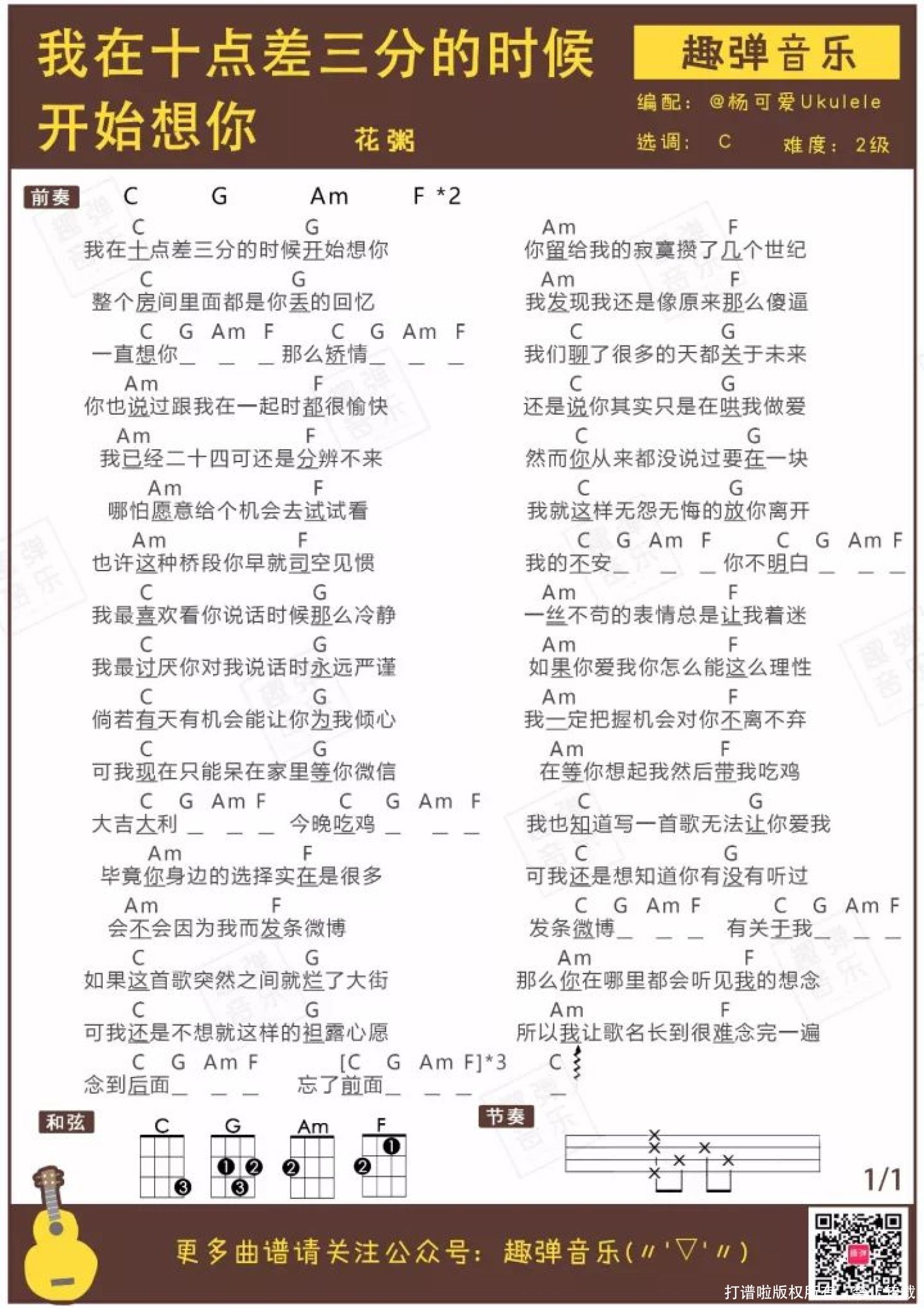 曲谱介绍: Aloha!老铁们,歌荒了吗?今天来给大家推荐一首画风不太一样的民谣。 一开始,我认为它文艺的歌名很符合我清新的气质,这温柔的旋律很配我优雅的形象。 然而仔细一听,歌词里好像混进了什么不得了的东西……? 看到那两个可疑的**了吗?没错,它因为太污被和谐了。 让人不禁好奇,这首集清新文艺与大胆直白于一身的民谣,到底是怎样的一首歌?   《我在十点差三分的时候开始想你》   ● 独立民谣歌手花粥作词作曲并演唱的一首歌曲,发行于2017年10月26日。 ● 歌曲描述了一个正在想念喜欢的人的普通女生的心境。   歌词直白大胆、吐槽毫不留情,是花粥的民谣最大特点。 没有拗口生涩的词汇,她唱的都是平凡日常中的小事,让人很容易觉得被猜中了心思。   “我一定把握机会对你不离不弃,可我现在只能呆在家里等你微信。”   这唱的可不就是傻傻盯着手机的自己吗: 你认真的样子真好看→你什么时候回我微信呢→你会发一条微博说想我吗? 有没有感觉膝盖中了一箭?一边想念,一边又觉得自己矫情。女孩子这些小心思,被花粥用民谣吐槽了个遍。   明明声线小清新,却有着一颗爷们儿一般的心,一首专治吹牛的《老中医》让她在网络上火了一把。   当全世界的民谣都在流泪喝醉,这个长相温柔的女孩却用吉他耍起了“流氓”。 有人说她的音乐简陋到只有四个和弦,也毫无唱功可言,而她回应:我不做惊天动地的英雄,只是一个快乐的肆意妄为的小女子。 别人怼她音乐低俗,她却一直抱着“玩音乐”的心:我从来不是专业的音乐人,没钱了就去livehouse唱唱歌,没事了就打打LOL。 高深莫测的苦情歌听多了,偶尔放飞自我,听听这样说话不拐弯的民谣,像大蒜一样呛口却又每天都离不开。   弹唱曲谱
