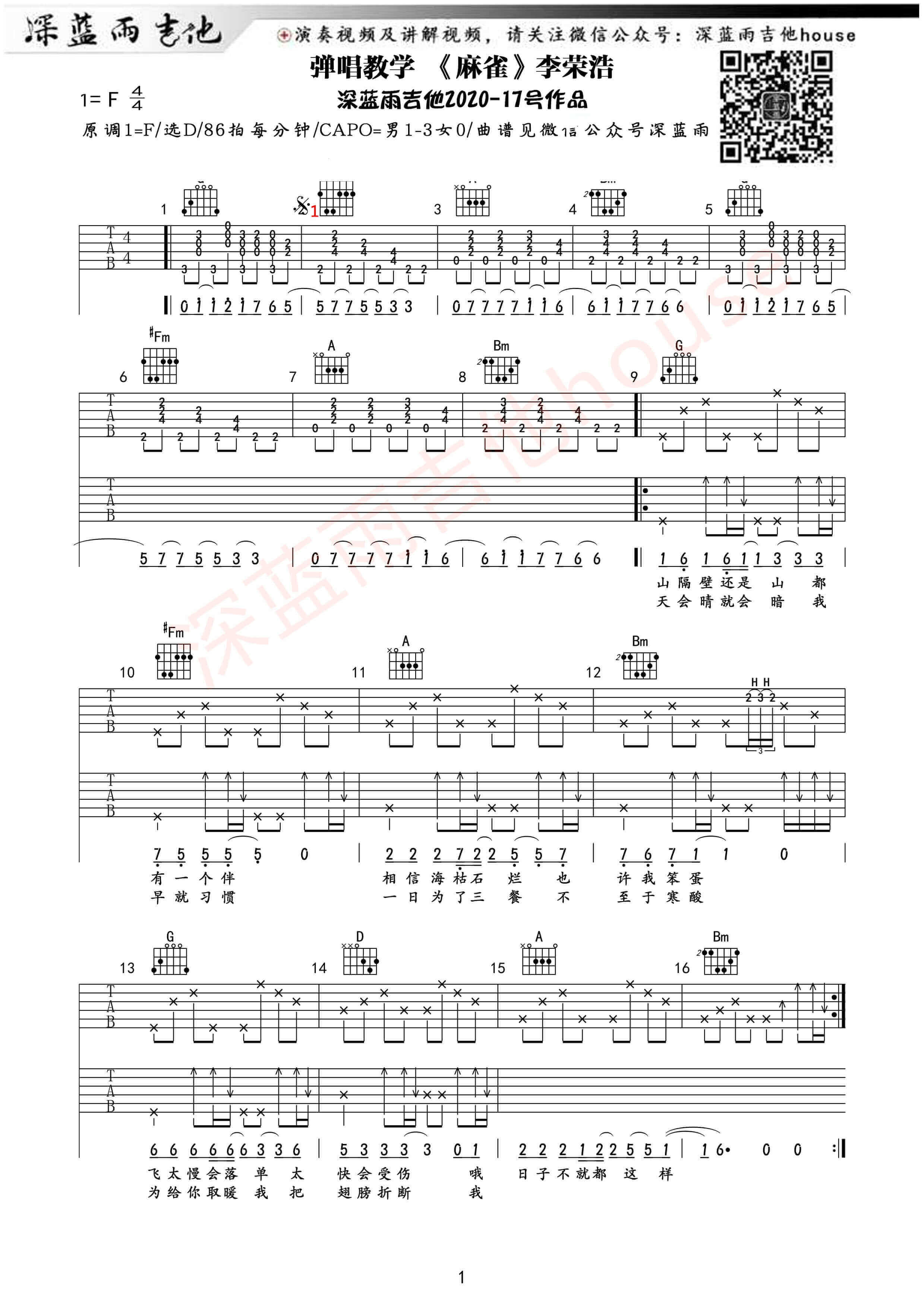 曲谱介绍: 《麻雀》吉他谱采用D调指法进行编配,由深蓝雨吉他改编制谱,在原曲的基础上保留另外的风味。2020年12月9日,李荣浩新歌《麻雀》上线酷狗音乐MV。与以往一模一样,李荣浩包揽录制,打谱,作曲等等全部工作,又开启自嗨模式。MV一镜到底的拍摄将观众的视线聚焦在画面当中,传递自己所要表达的观点:麻雀正如都市中奋斗的人,都在拼命飞翔,只为证明自己~TIPS:在这里向大家推介另外一首,它就是别怕我在吉他谱啦,非常动听的一首曲子!