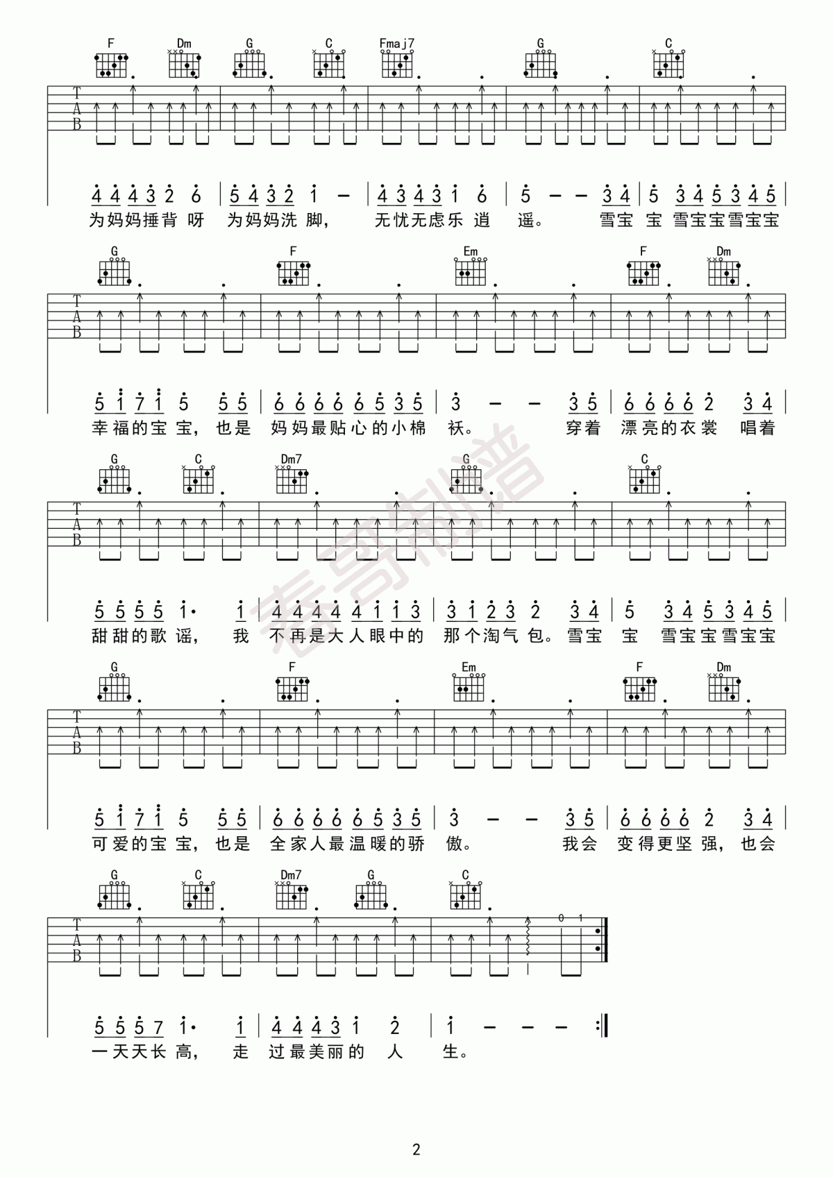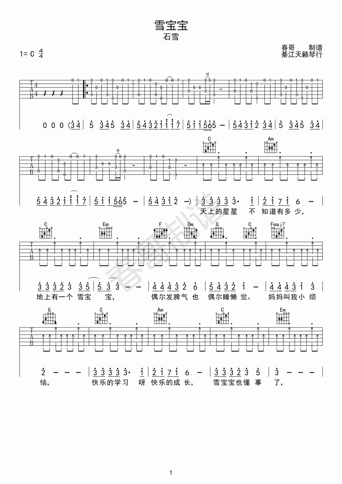 曲谱介绍: 石雪《雪宝宝》吉他弹唱谱,采用C调指法编配,共有2张高清图谱,免翻页排版设计。