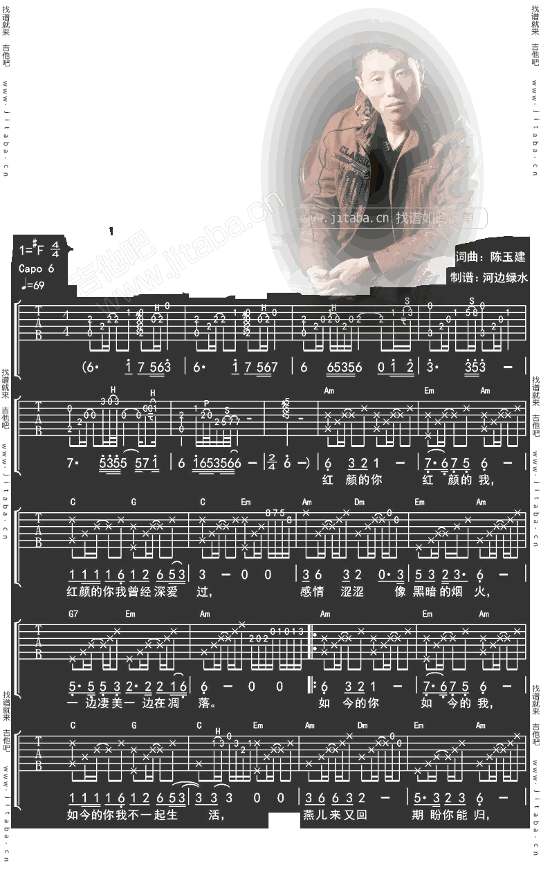 曲谱介绍: 红颜你我吉他谱采用了#F调指法,由河边绿水编配完成。听兄弟说,听见下雨的声音吉他谱听了耳朵会怀孕,快快学起来,学完去撩妹!