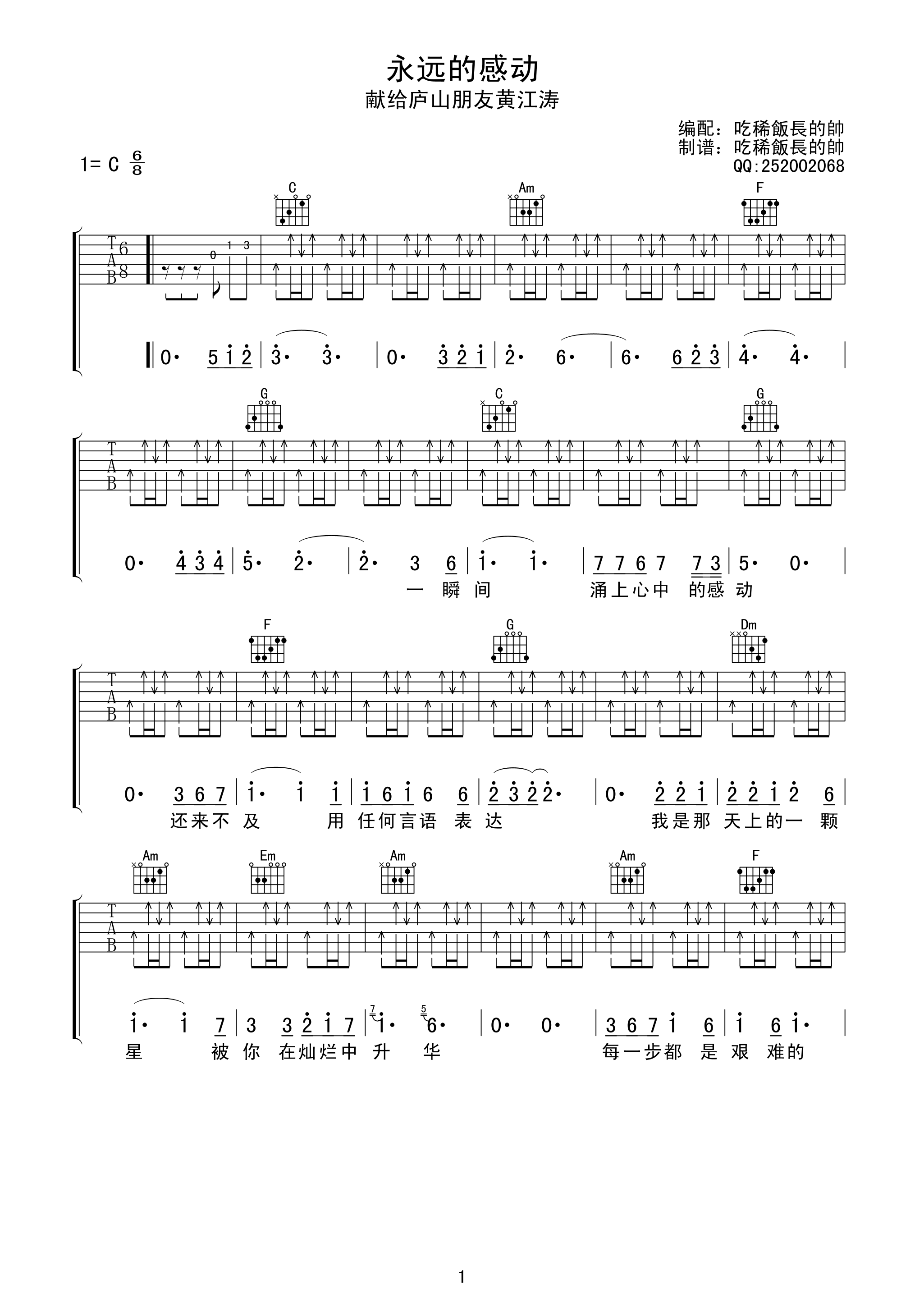 曲谱介绍: 永远的感动吉他谱采用了C调指法,由吃稀饭长得帅编配完成。另外,这首广东爱情故事吉他谱也超级好听,小伙伴们有福啦,还不去练起来?