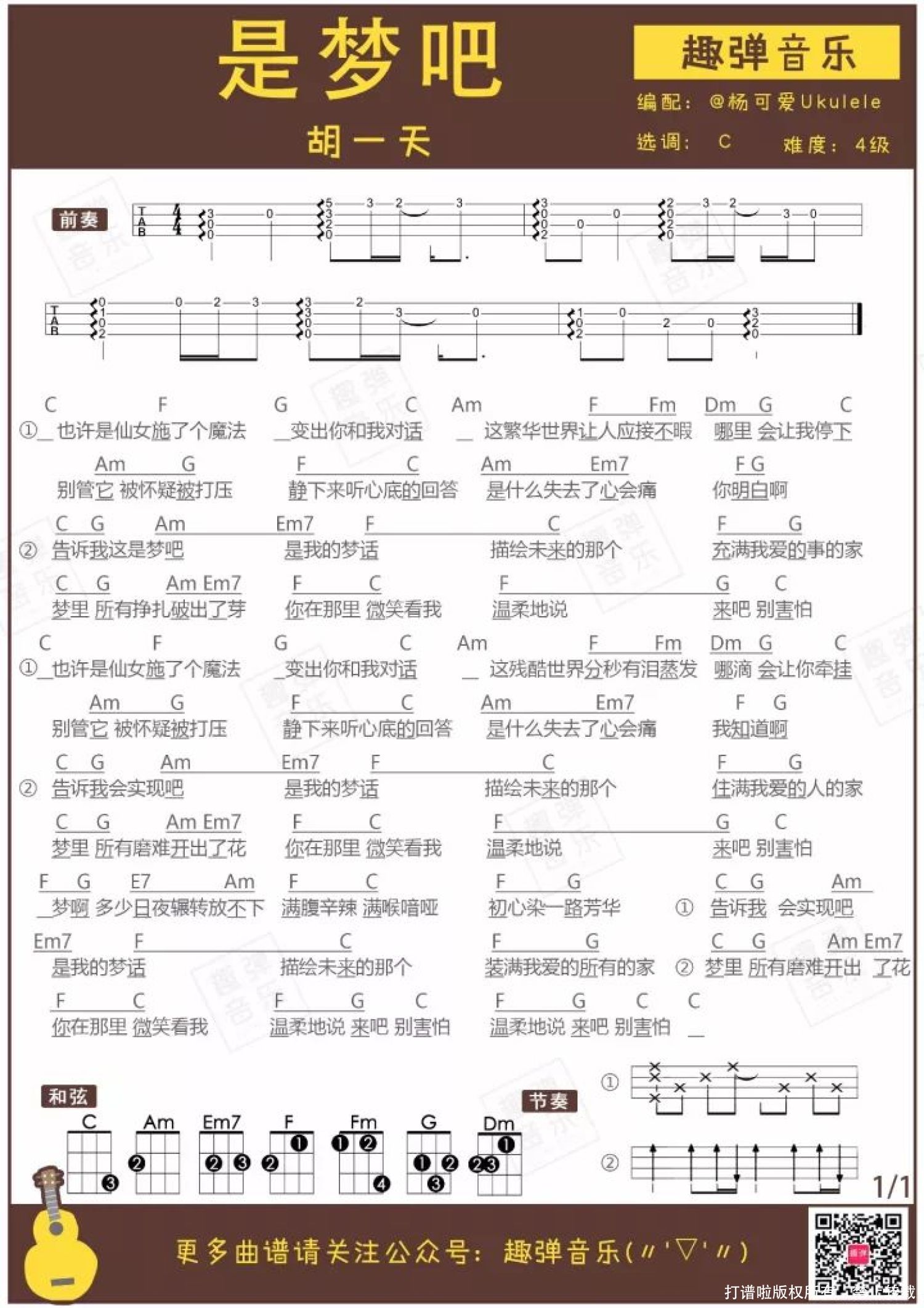 曲谱介绍: 满足所有少女幻想   这首片尾曲《是梦吧》直接由扮演男主角江辰的胡天一来演唱,简直就是江辰的内心独白。 有着一米八八身高的江辰满足了少女所有的幻想:外形帅气,成绩优秀,默默守护喜欢的女孩的样子分分钟苏炸天。 嘴上说着不要,心里却很老实,其实江辰不是高冷,只是害羞到不知该如何表达。 他也会吃醋,也会偷看陈小希睡着的样子。这样的反差“苏”得让少女们尖叫。   《是梦吧》尤克里里谱