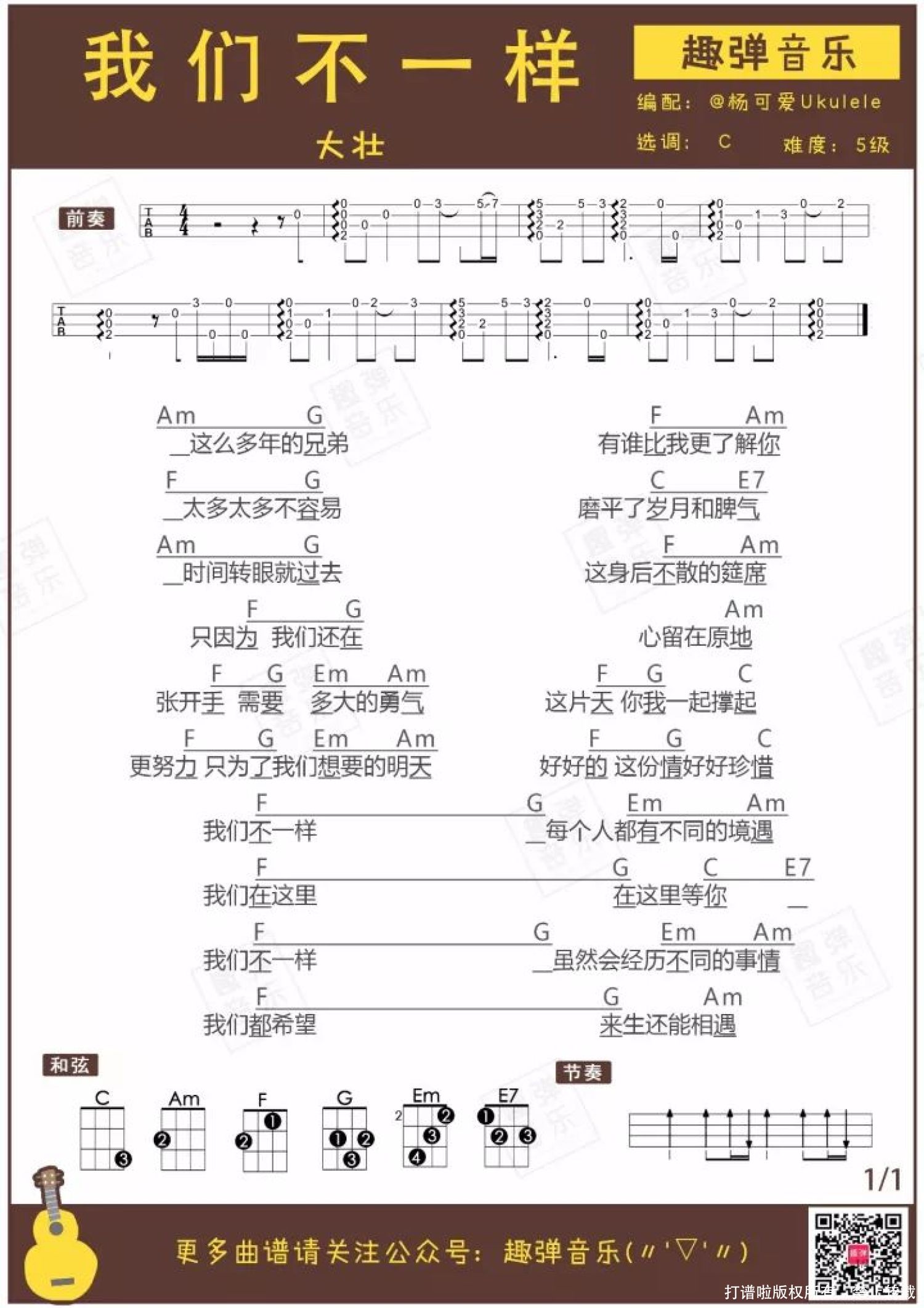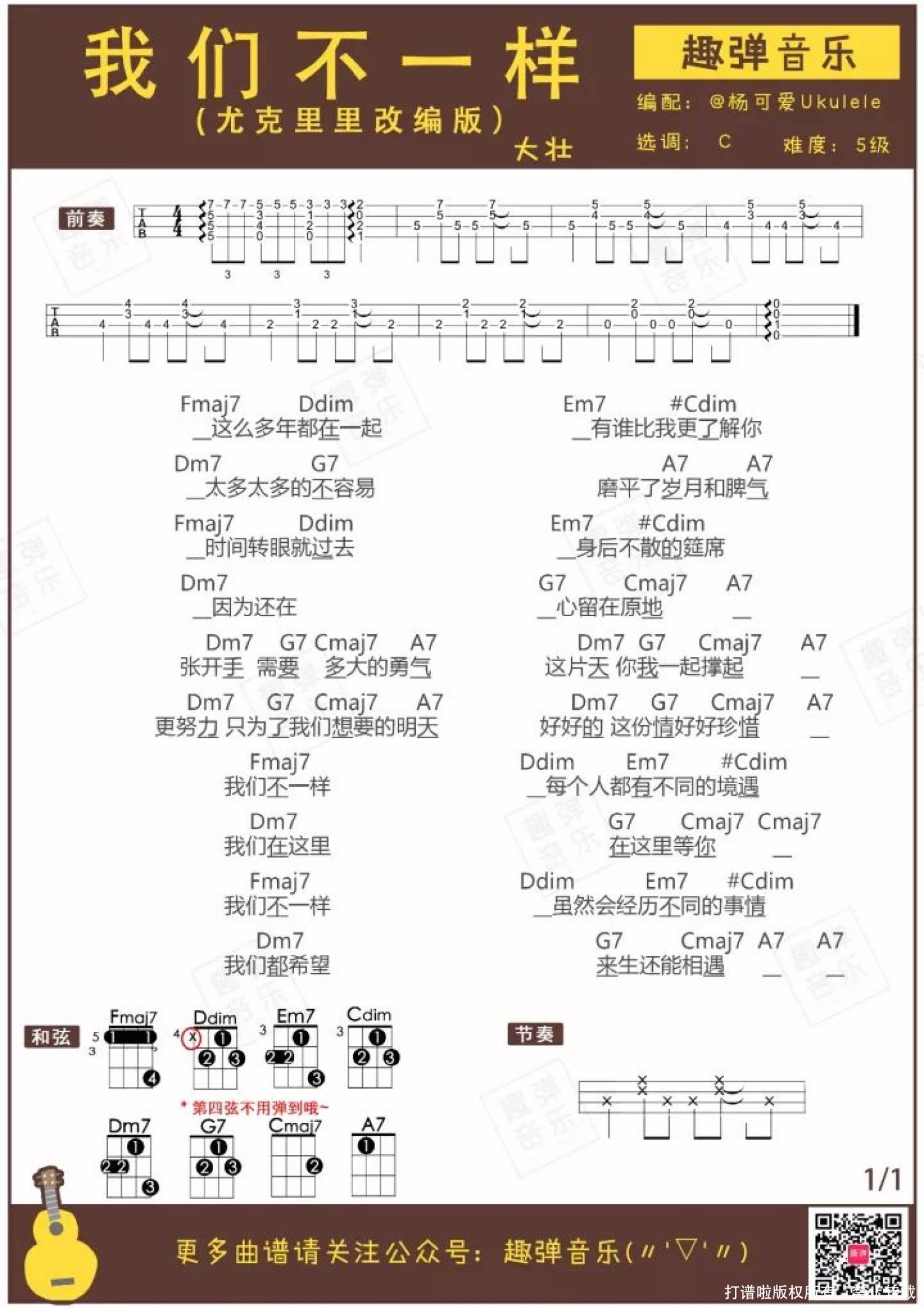 曲谱介绍: <我们不一样> 对不起,我用尤克里里“毁了”这首歌   提到这首歌的歌名,一个沧桑低沉、自带回音的男声一定会在你的脑海中响起。 因为常被单身狗用来自嘲,这首叫《我们不一样》的歌成为新一代扎心神曲。 ※ 全世界都在谈恋爱,只有我不一样,散发着单身狗的清香。   第10086次被原唱的低音炮洗脑以后,杨可爱手里的小U有了一个大胆的想法,并终于对这首歌下手了…… 来听听又一首被小U“毁了”的神曲,变成了什么样子吧!   我们不一样-Ukulele版 弹唱:杨可爱 用琴:UKU200C(远航系列) 想不到吧!原曲的沧桑低沉、豪爽接地气都被尤克里里颠覆了,变得优雅浪漫如咖啡馆小曲儿~♪ 或许优雅文艺和通俗洗脑本来就只有一线之隔,也许它们之间只差一把尤克里里~   关于歌曲 ● 由高进填词作曲,张亮编曲,大壮演唱的歌曲。 ● 歌曲唱出了兄弟情,成为励志神曲。 一夜之间,大壮那声自带回音、沧桑低沉的“我们不一样”占据了所有人的脑海。 因为通俗好唱,又被各大段子手作为视频背景音乐,这首歌一不小心就红遍网络。 这首歌的演唱者大壮,是直播软件上的一位播主。留着寸头又酷又痞的他因为标志性的音乐风格有着不少粉丝。 “这么多年的兄弟,有谁比我更了解你。太多太多不容易磨平了岁月和脾气。”看似通俗的歌词,其实带着细腻的情感和真实的温度,唱出了很多男人的心声。   改编版曲谱 原版曲谱