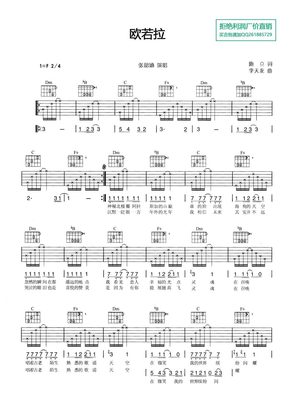 欧若拉吉他谱 - 张韶涵 - F调吉他弹唱谱