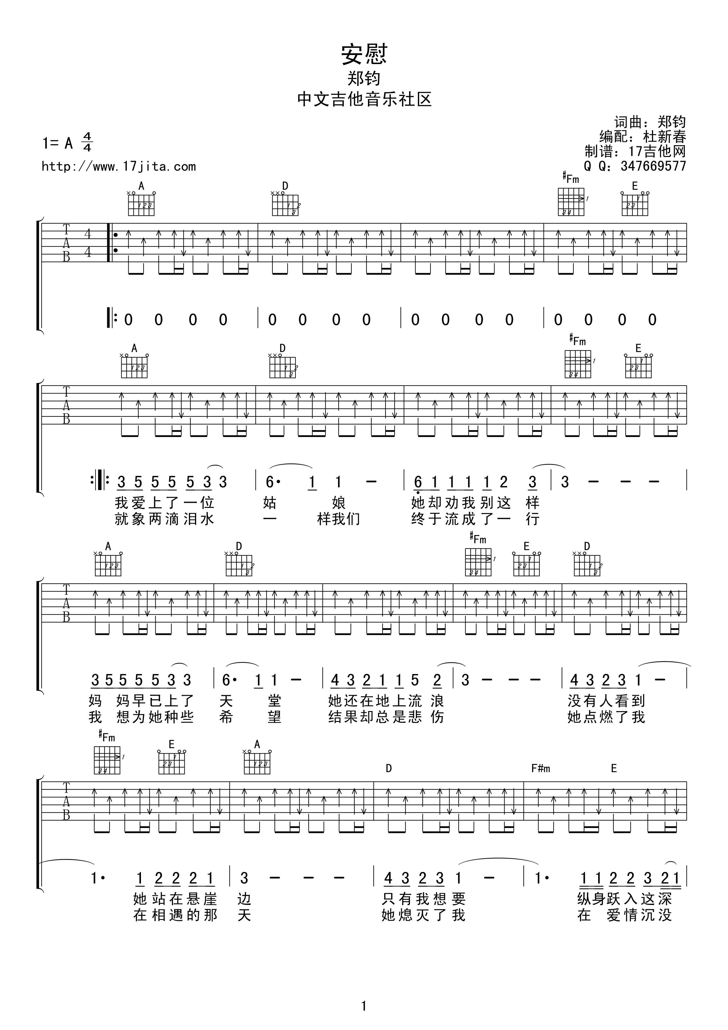 安慰吉他谱 - 郑钧 - A调吉他弹唱谱