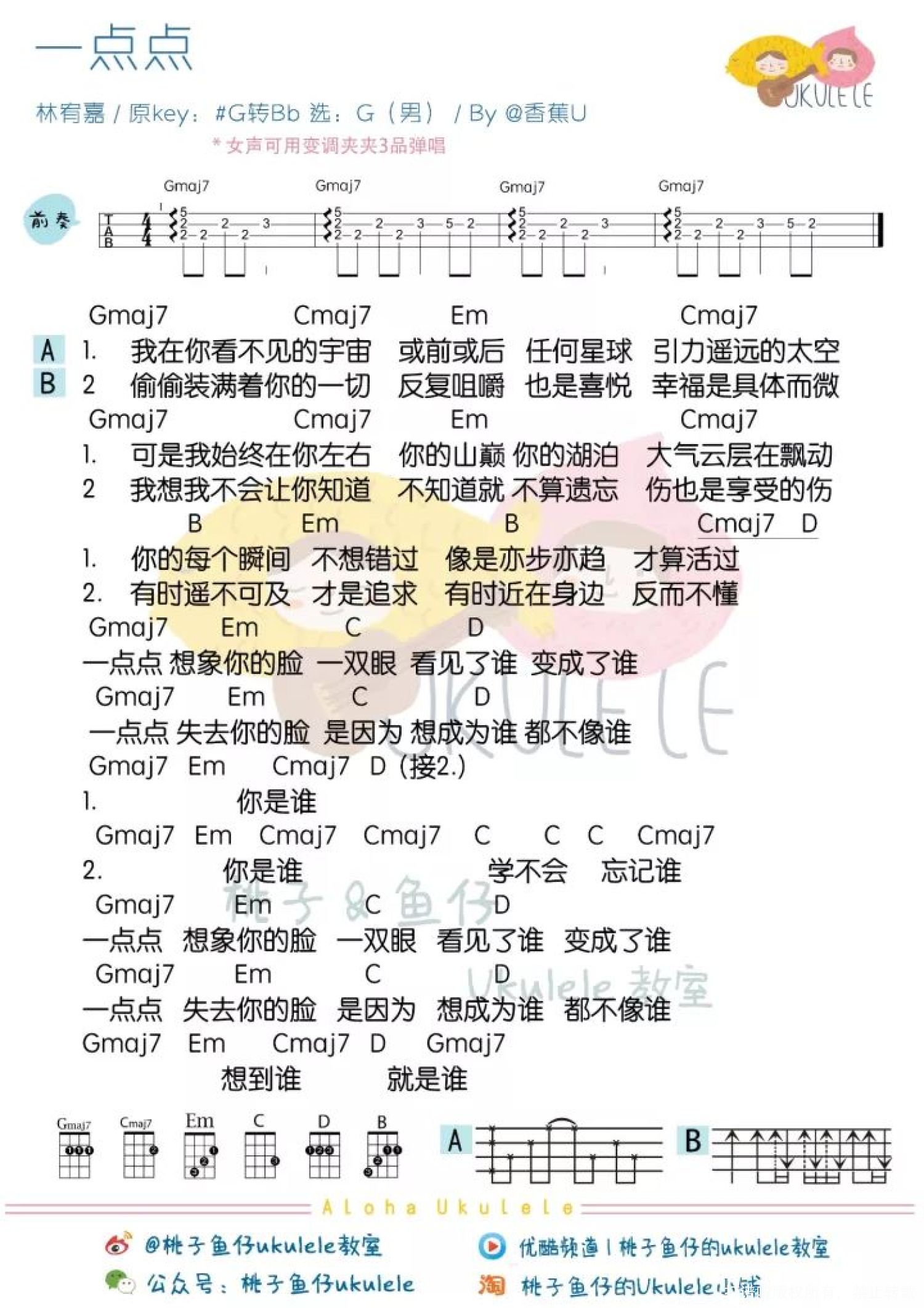 曲谱介绍: ● 苏打绿虽然暂时休团了,但主唱青峰仍不时地透过网络与打粉们互动~因此也成立了“一首小青歌”的单元满足大家的耳朵^^ @吴青峰:“之前 @苏珮卿 說要幫我伴奏,終於約成功了!這次我們演唱由 @林宥嘉YogaLin作曲,我來填詞的〈一點點〉。 當初宥嘉找我寫這首歌詞的時候,demo讓我一聽就愛上,其實前後寫了兩個完全不同的版本,有機會或許也可以跟大家分享。以後我們再來一起寫更多的歌吧! 不過很可惜這次珮卿只有演奏豎琴,沒有唱歌,所以如果你想看珮卿美妙的歌聲,又恰巧在台灣的話,不要錯過她11月25日在台中TADA方舟,或是12月22在台北 Legacy的演出!”   「一点点」 尤克里里弹唱谱