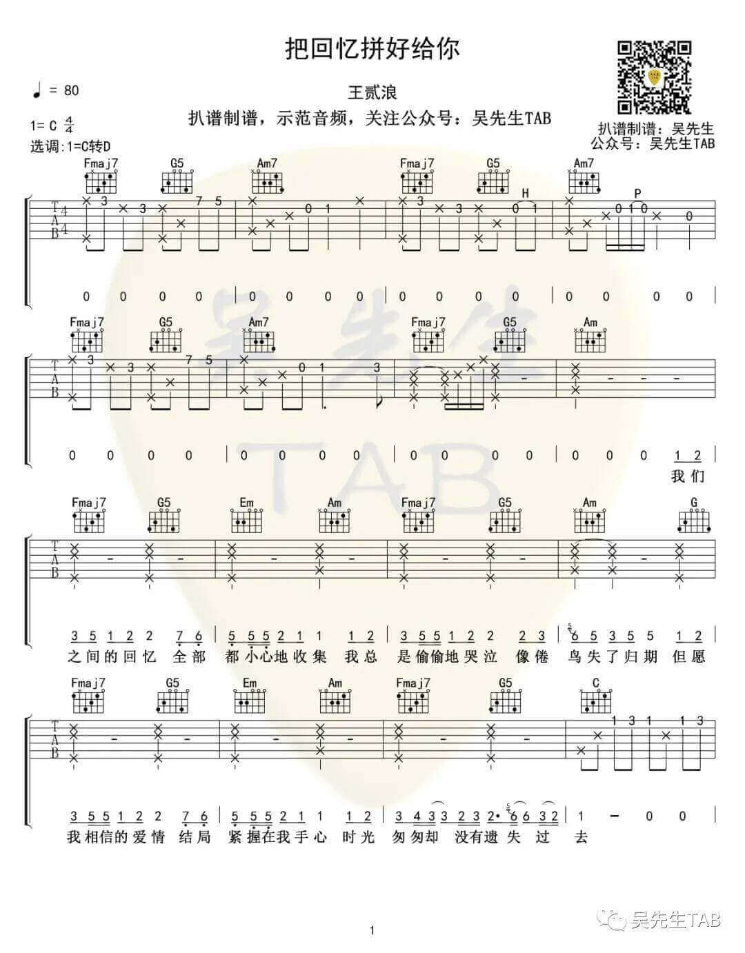 曲谱介绍: 把回忆拼好给你吉他谱采用了D调指法,由吴先生扒谱制谱。这首《把回忆拼好给你》由王贰浪演唱。原曲为《願い~あの頃のキミへ~》,由一只然进行中文填词。这首给我你的爱吉他谱也很帅,快点去学习吧,没学会的小伙伴要继续加油喔,稳!