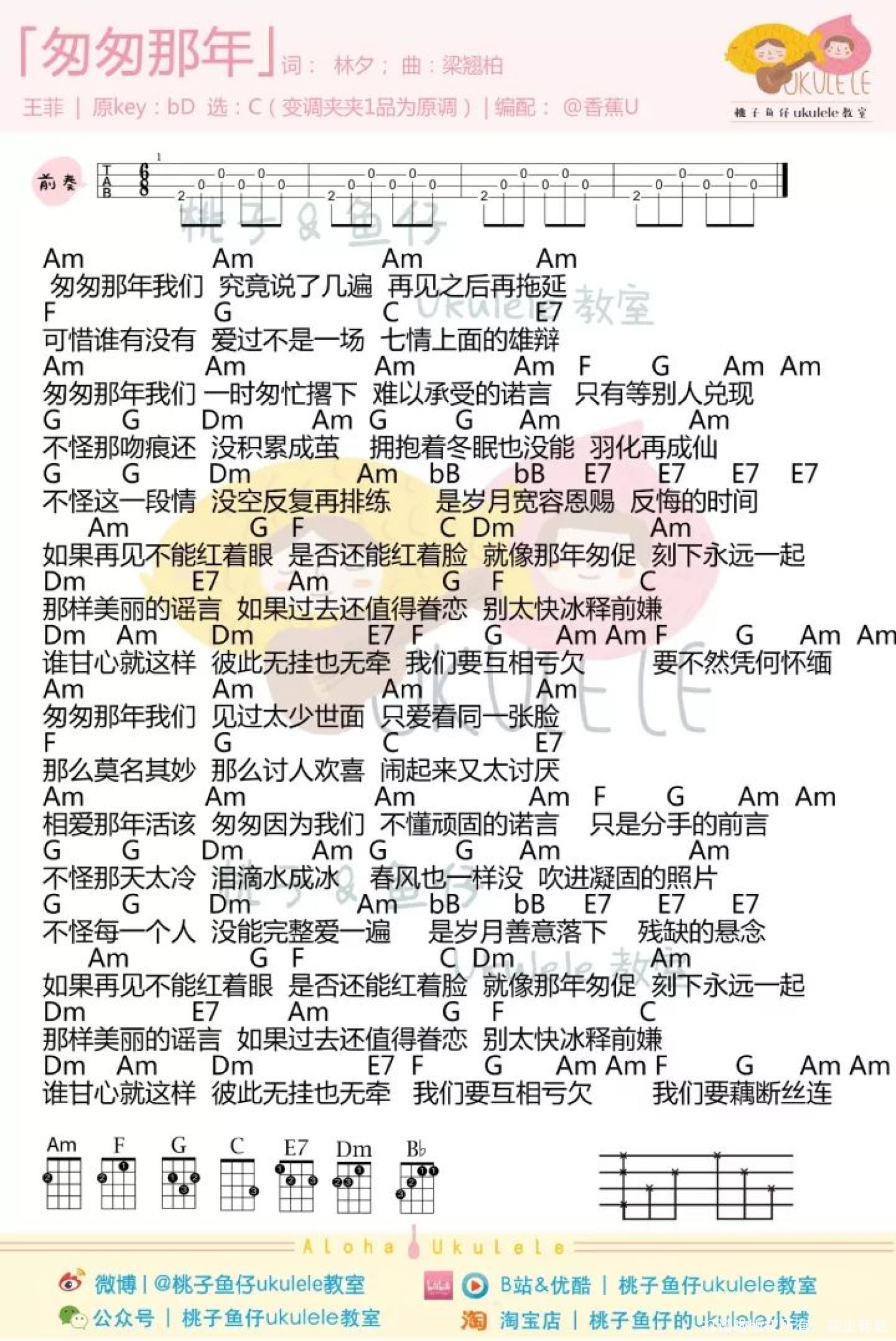 曲谱介绍:   匆匆那年尤克里里弹唱教学   尤克里里谱