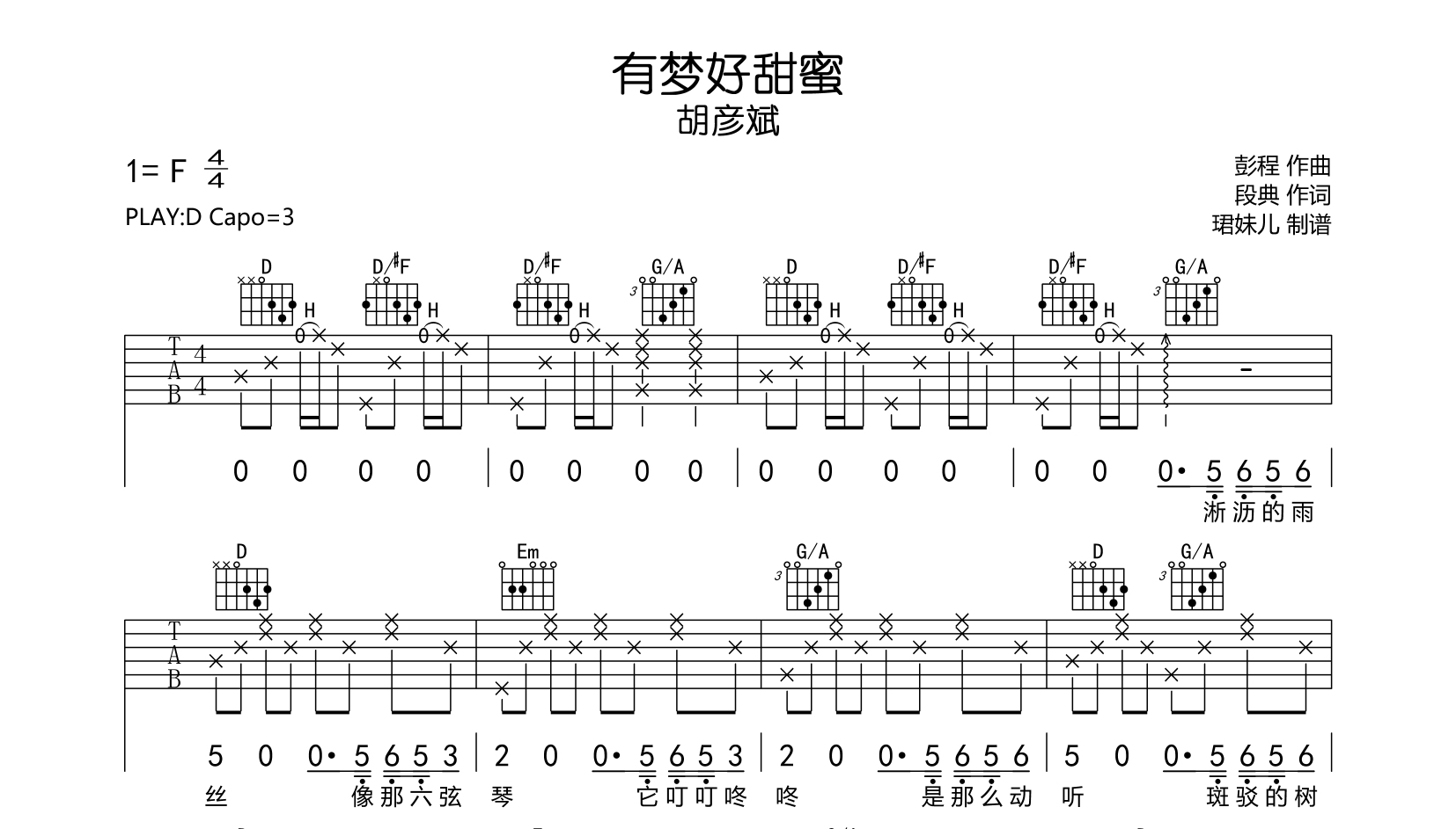 有梦好甜蜜吉他谱 - 胡彦斌 - D调吉他弹唱谱