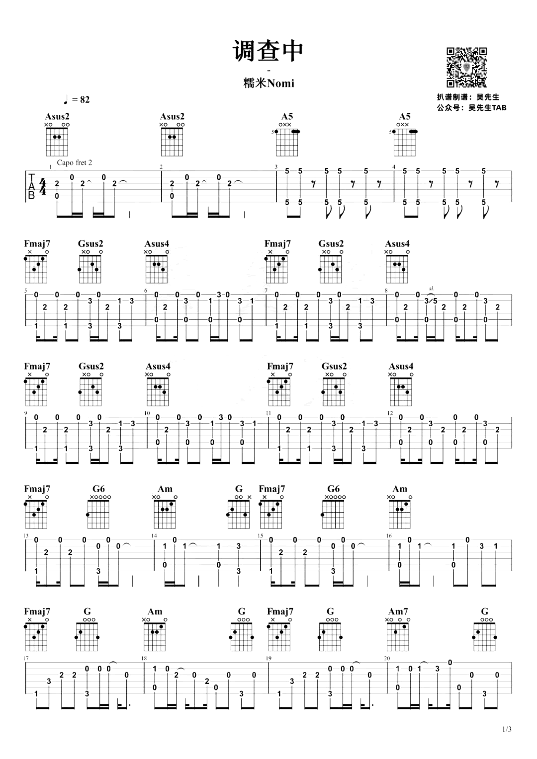 曲谱介绍: 调查中吉他指弹谱,Nomi糯米演唱,《开端》影视剧BGM推广曲,穿越时候的背景音乐,《调查中》吉他独奏谱,三张图片六线谱。