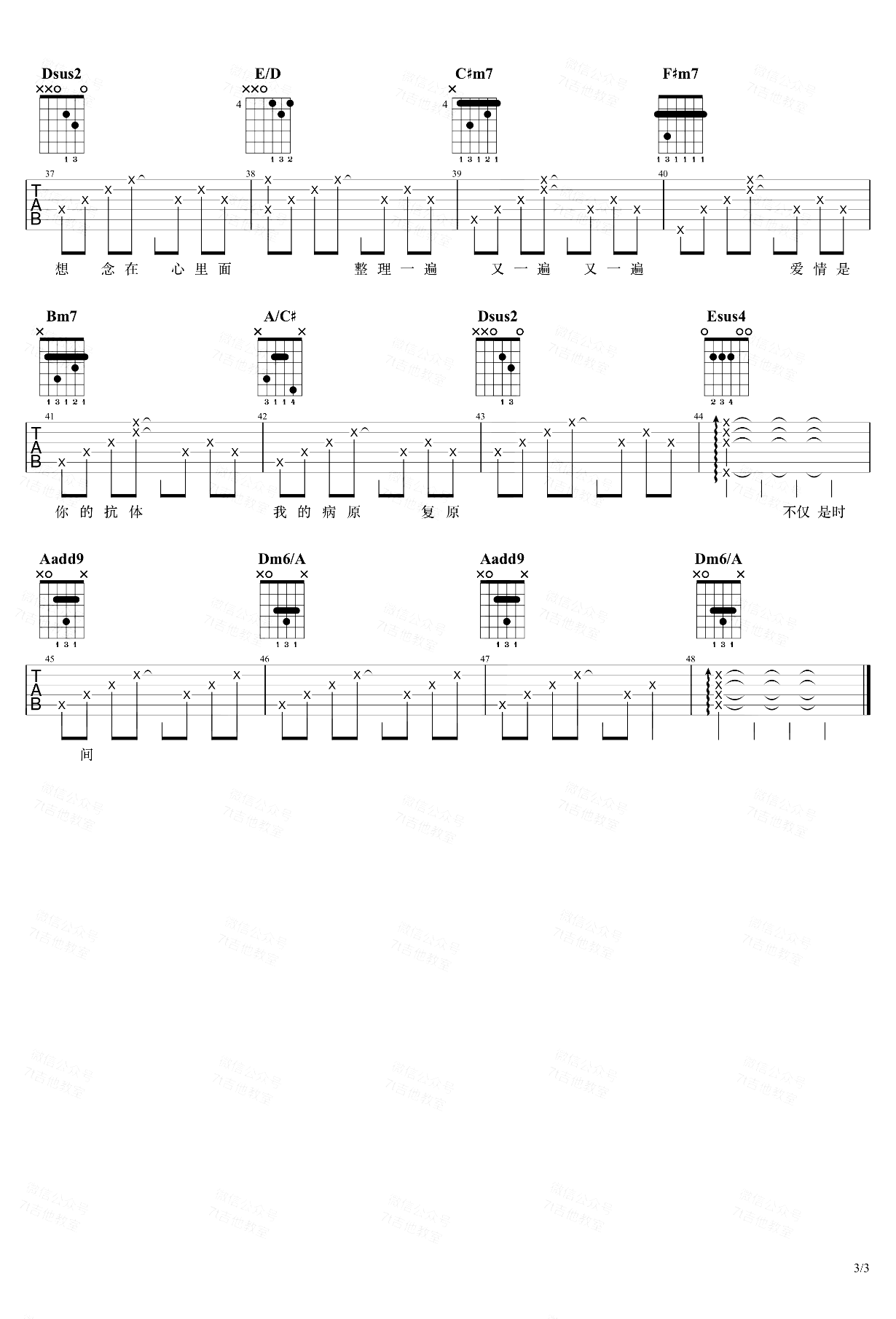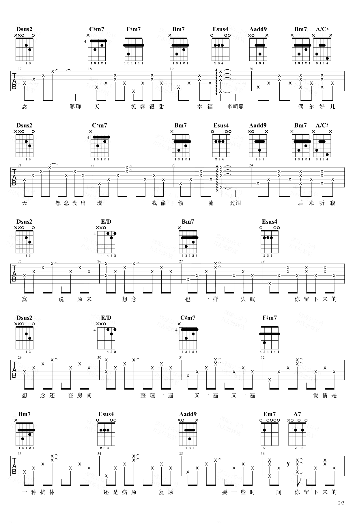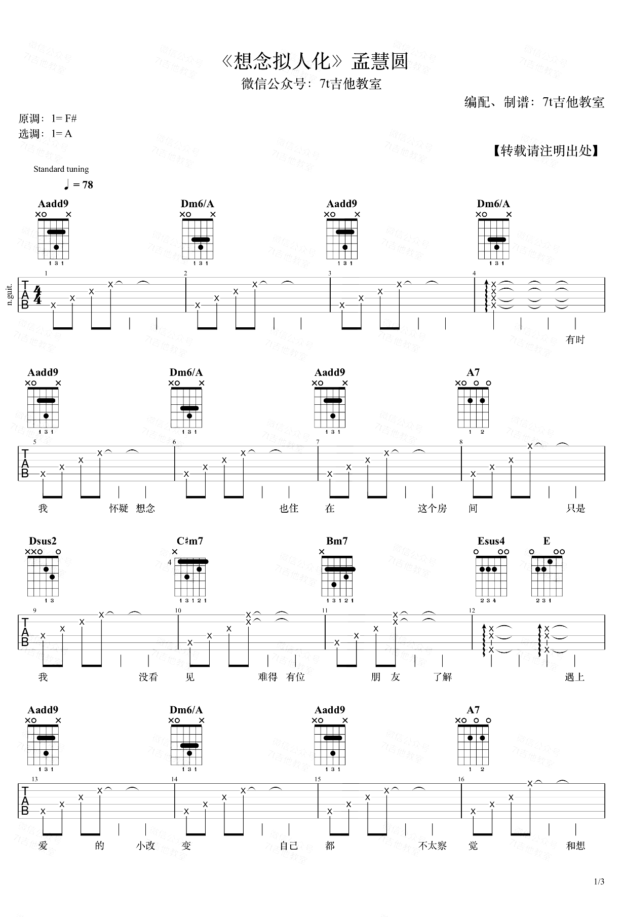 曲谱介绍: < 想念拟人化吉他谱,宝藏歌手孟慧圆演唱,原调是F#大调,采用A大调的指法来编配,《想念拟人化》吉他演示视频里是标准音调弦,变调夹夹在第1品。想弹原调的朋友不适合用这个谱子哦……歌曲前奏和主歌多次用了四级小和弦Dm6/A,增加离调的味道,其中还加了6音,并且使用转位把A作为最低音,使得和声更丰富;主歌还用了副属和弦 A7 → Dsus2,流行歌里面副属和弦的运用还是很常见的。
