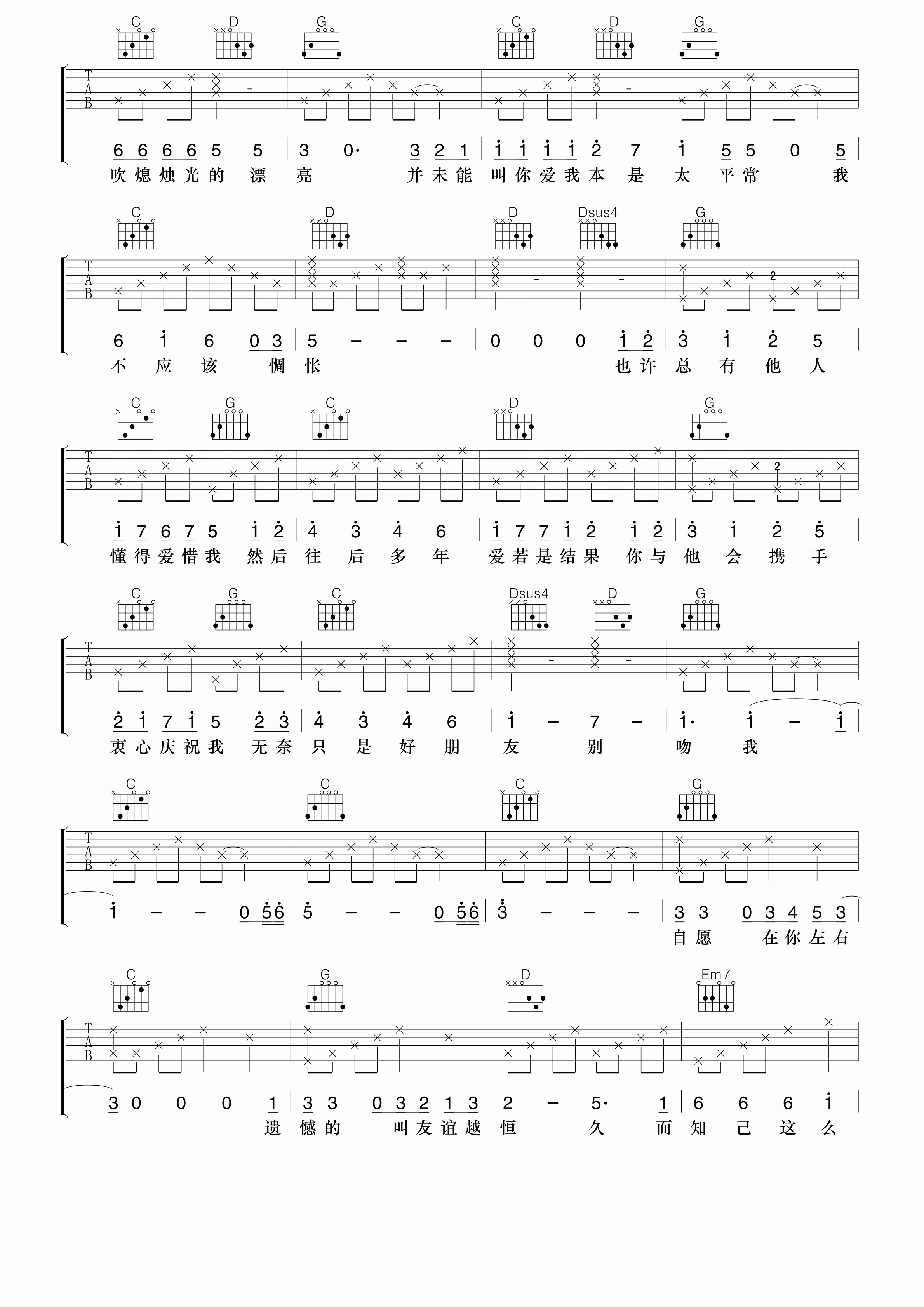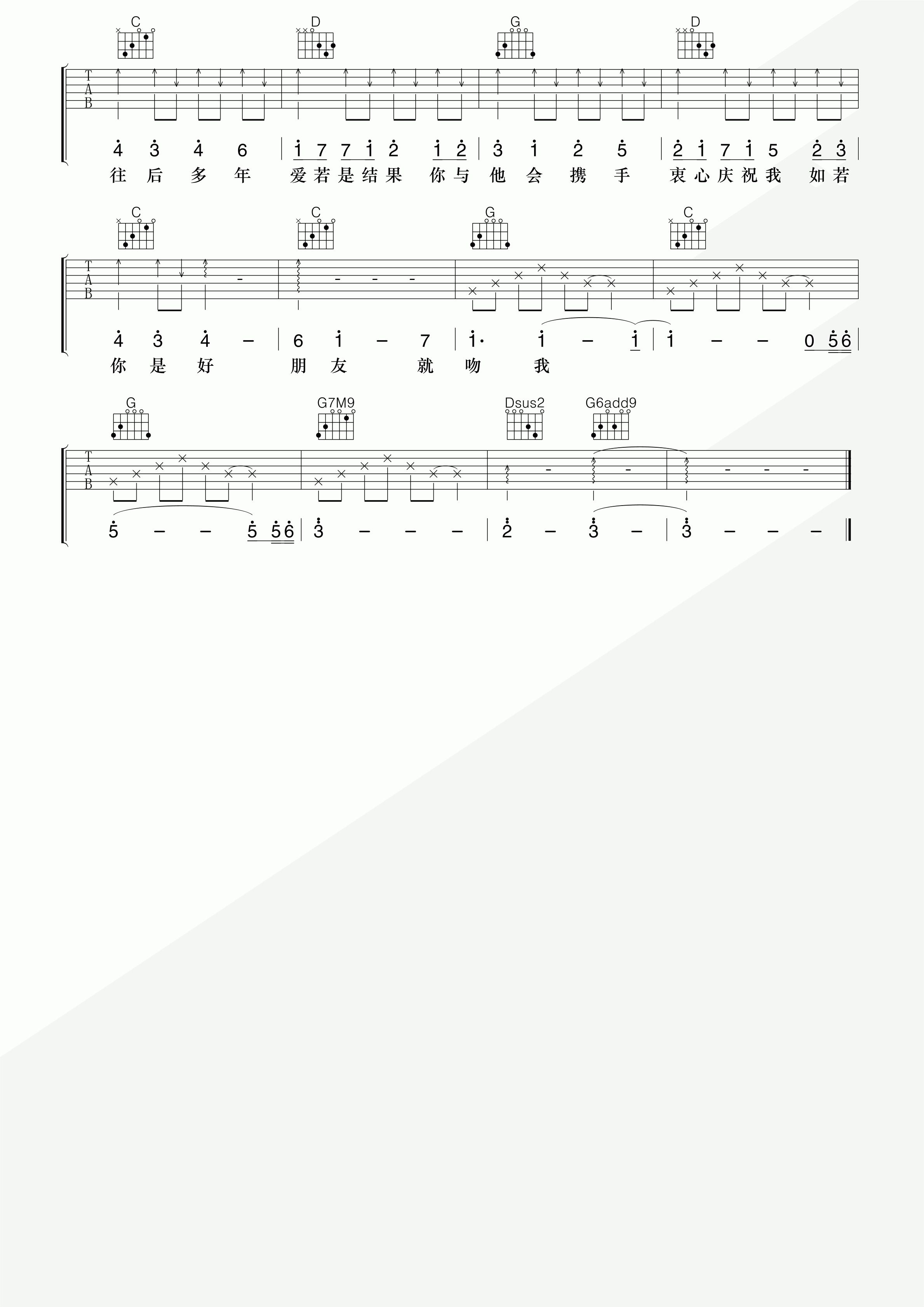 曲谱介绍: 好朋友吉他谱采用了bB调指法,由小叶歌编配完成。在这首歌曲之中,能够引起很多人的强烈的共鸣,让我们心动不已,除了这首谱以外,属于吉他谱也非常不错,速度去围观一下吧!