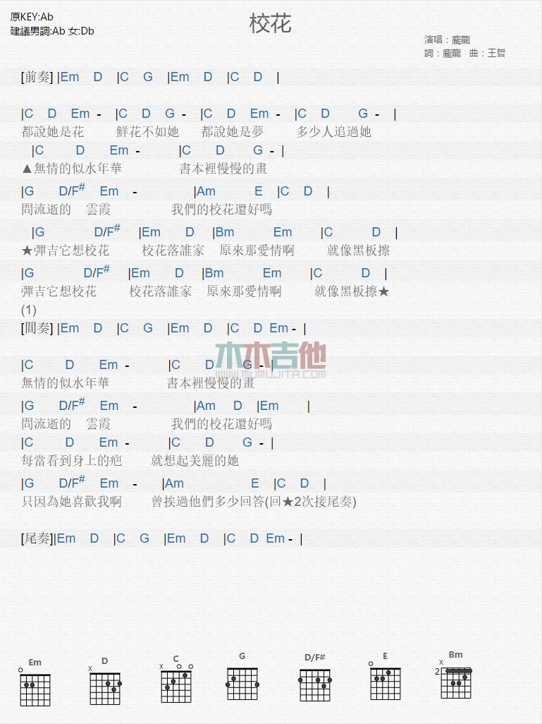 曲谱介绍: 校花《校花_》吉他弹唱谱,共有1张高清图谱,免翻页排版设计。