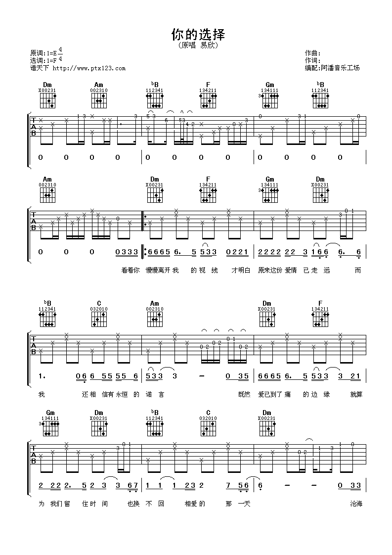 曲谱介绍: 你的选择吉他谱采用了F调指法,由阿潘音乐工场编配完成。这是一首2006年发布的老歌,易欣演唱的一首经典伤感情歌《你的选择》,旋律凄美忧伤,歌声催人泪下。它的曲调也犹如一股清水汩汩而流,但是它仍然可以调动起人们的情绪,每首歌感觉都有一个画面。TIPS:在这里向大家推介另外一首,它就是命中注定吉他谱啦,非常动听的一首曲子!
