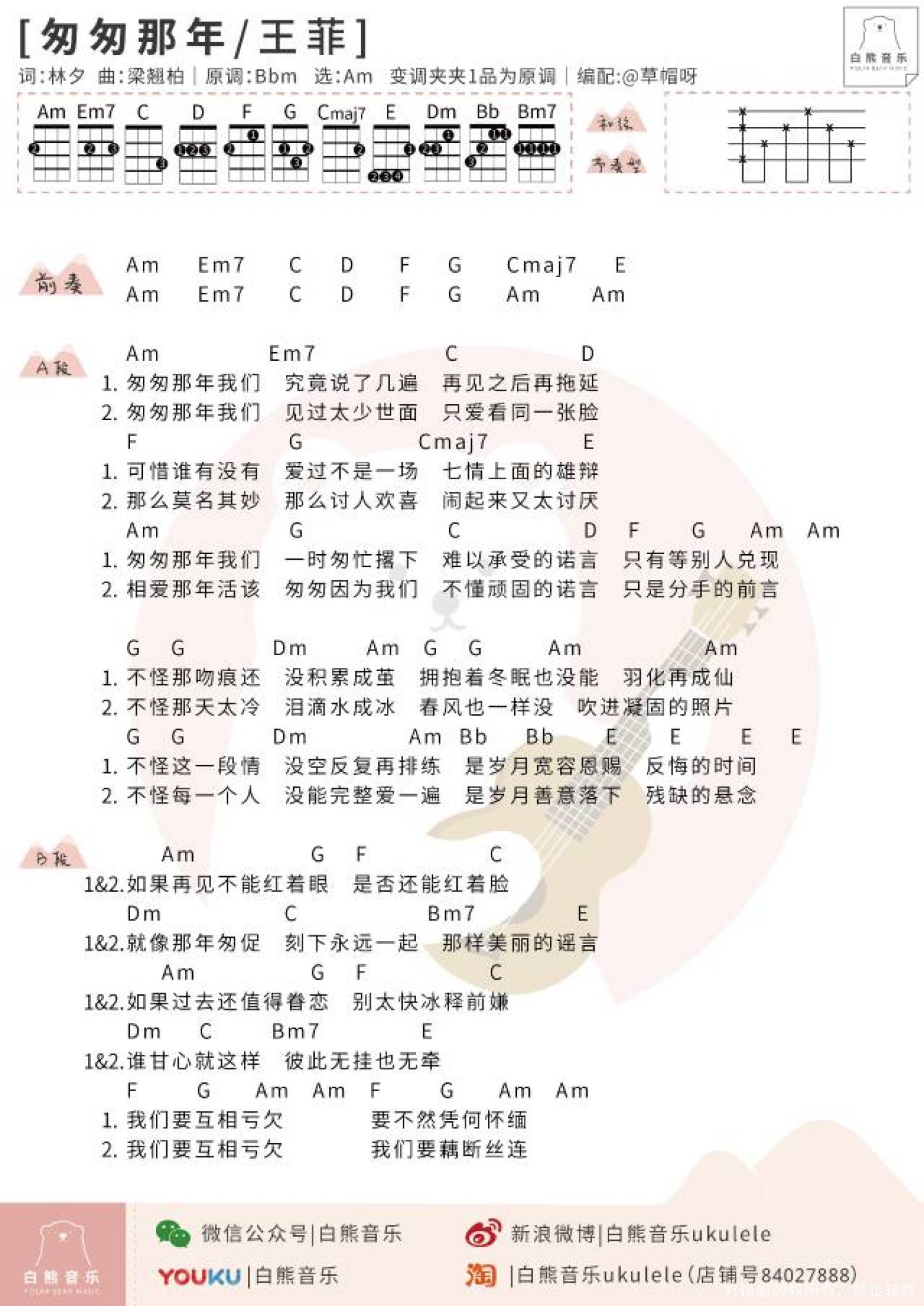 曲谱介绍: ◎王菲动人的声音配上感人的歌词,每一个音符都在敲击着听众的内心,演绎着电影中感人的剧情和动人的情景,令人动容。 歌词戳人,MV戳泪,直接引发了观众对于青春的集体共鸣,部分网友经不住呼朋唤友,相约一起缅怀青春,歌曲和电影同名,无缝对接,主题曲意境密切贴合电影故事,直击人心,这是《匆匆那年》的最大优势。   《匆匆那年》尤克里里谱