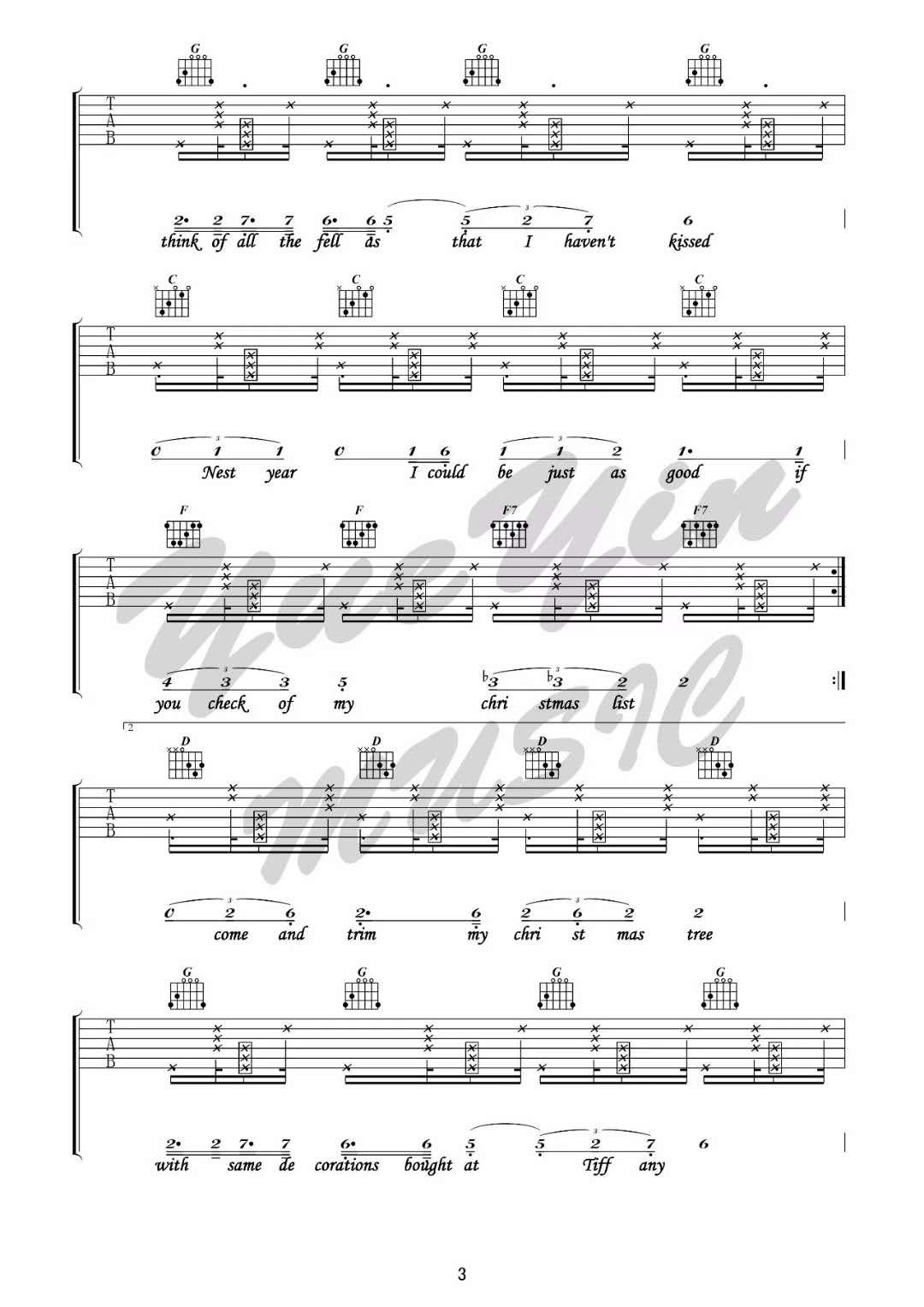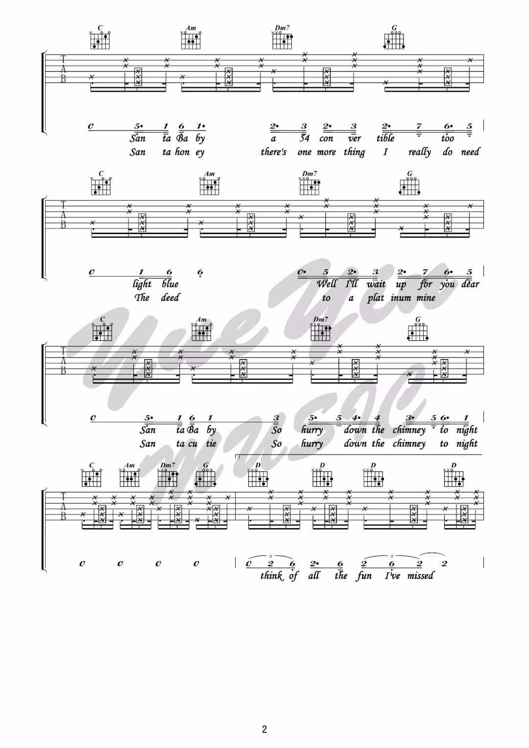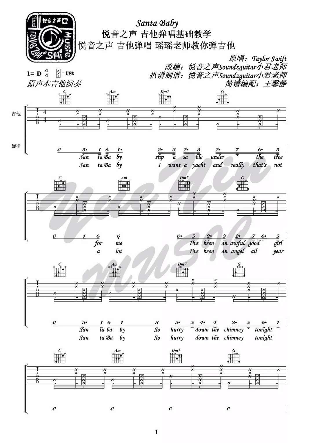 曲谱介绍: Santa《SantaBaby_D调》吉他弹唱谱,采用D调指法编配,共有5张高清图谱。