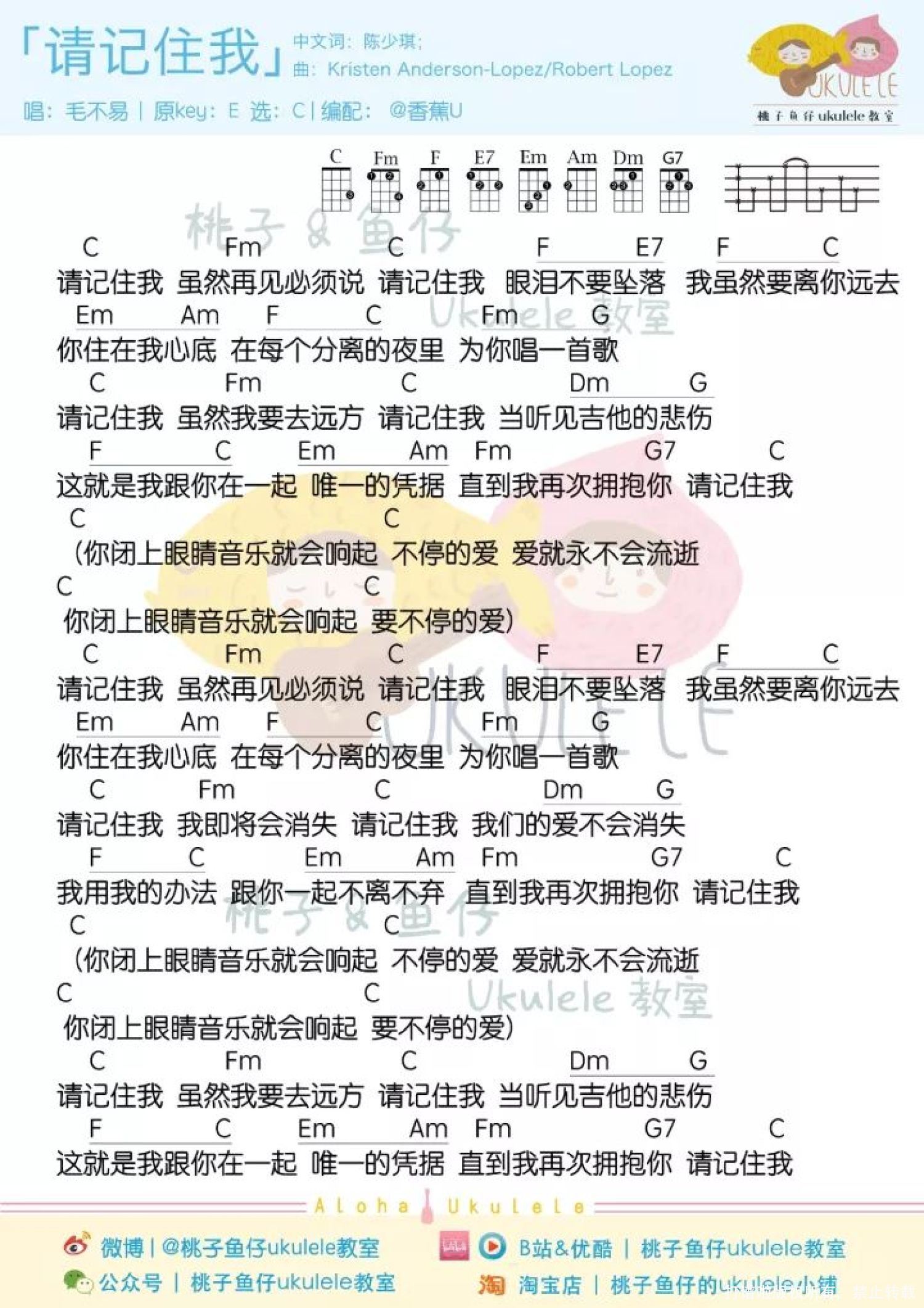 曲谱介绍: 歌曲如毛不易本人一般质朴温暖又隐隐带着铿锵的力量,而毛不易也以自己醇厚熨帖的嗓音唱出了内敛坚定的家族之爱。   《请记住我》尤克里里谱