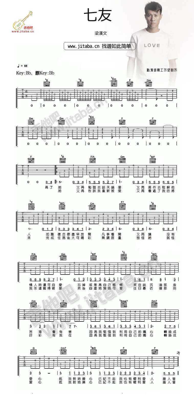曲谱介绍: 七友吉他谱采用了B调指法,由琴谱网编配完成。另外,这首湖水吉他谱也超级好听,小伙伴们有福啦,还不去练起来?