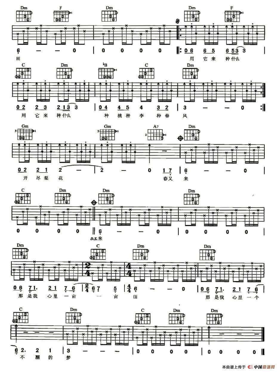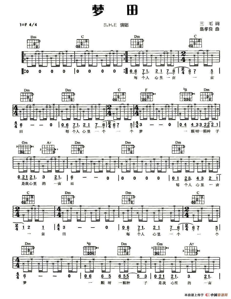 曲谱介绍: 梦田吉他谱采用了F调指法,由中国曲谱网做谱。《梦田》是中国台湾女子演唱组合S.H.E翻唱的一首歌曲,《梦田》这首歌有很多人翻唱过,歌曲诉说我们的梦想不断被现实击碎。号外:在这里小编要推荐这首爱殇吉他谱,它也很好听,大家赶快学习起来啦,不要犹豫!