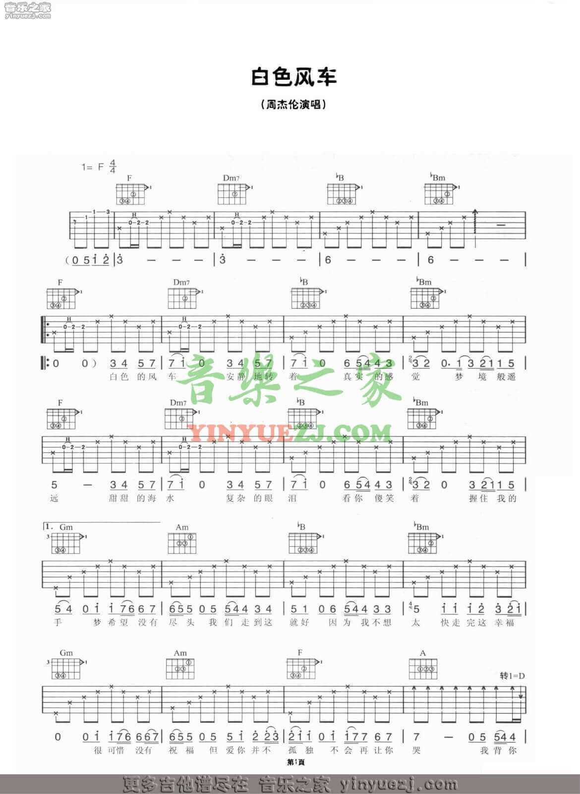白色风车吉他谱 - 周杰伦 - D调吉他弹唱谱