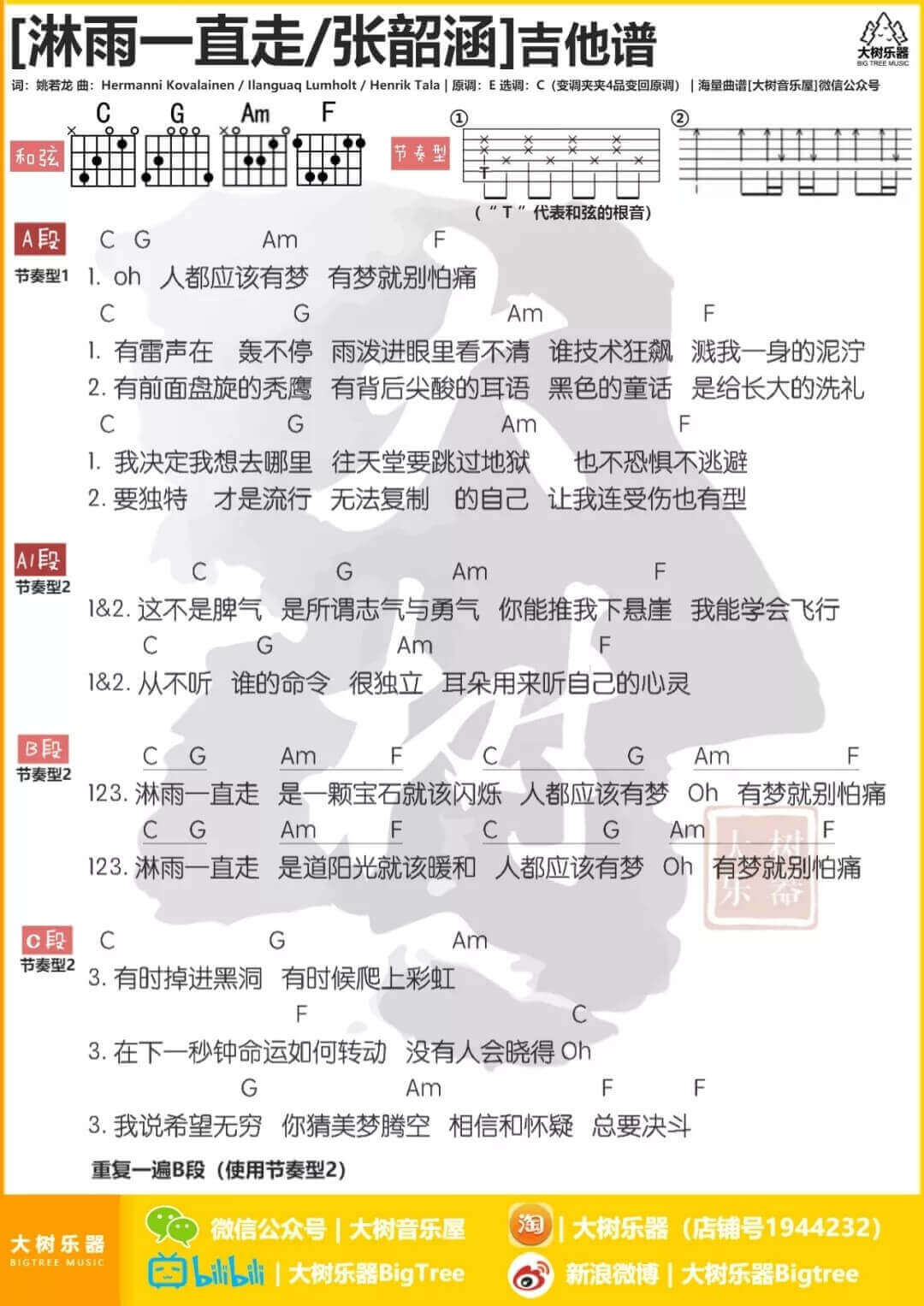 淋雨一直走吉他谱 - 张韶涵 - C调吉他弹唱谱