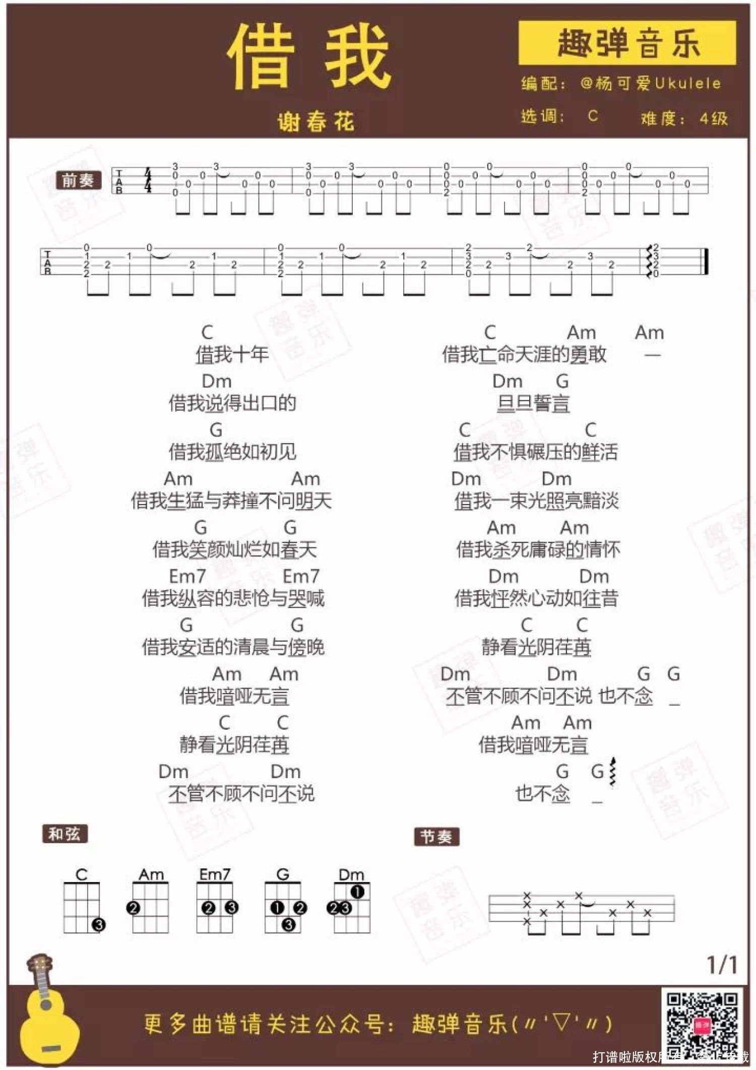 曲谱介绍: <借我> 谢春花 | 听一次就爱上,温柔女声带来的诗意民谣   民谣常常是安静低调的,需要一点点缘分去“遇见”。 入睡前,想找一首宁静舒缓的音乐。无意碰到《借我》,好听到让我睡意全无。 干净温柔的嗓音,简单好听的和弦,安静流淌的旋律,还有诗意的歌词,清新美好得就像洒在树叶上的阳光,只听一遍就爱上了。 后来,入睡前和看书时的背景音乐里就再也少不了谢春花的声音。 旋律虽极为简单平淡,却能洗净内心的浮躁,让人一听钟情。   谢春花 /《借我》   ● 由锦屏填词、谢春花作曲的一首民谣。 ● 收录于2016年谢春花发行的首张专辑《算云烟》。 “借我”描述了一种想要打破庸碌生活却没有彻底颠覆的勇气的心情。 没有浪迹天涯的孤独寂寞,没有爱而不得的悲苦爱情,谢春花的歌词常常有一种古风感,像淡茶一般值得品味。 如果我告诉你唱出这样淡雅清新的歌曲的小姐姐是个怎样的人,我怕你会像我一样爱上她。 她自学吉他、尤克里里、口风琴等乐器,会作词会作曲,专业上却是不搭边的英语翻译学霸,还写得一手好字能为自己的专辑手写歌词、画插画。   如此优秀的“别人家的小孩”,丝毫不高冷,在微博上可爱幽默,亲切得像身边和我们年龄相仿的一个小姐姐。 不问昨日和明天,只把此刻过得鲜活亮丽。用这首《借我》,给自己一个潇洒面对生活的勇气吧♪   歌曲演示