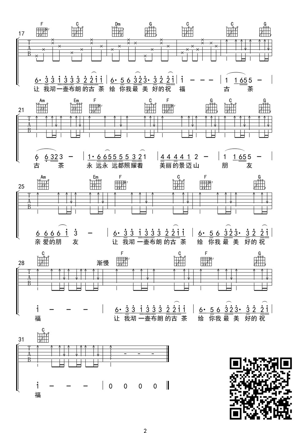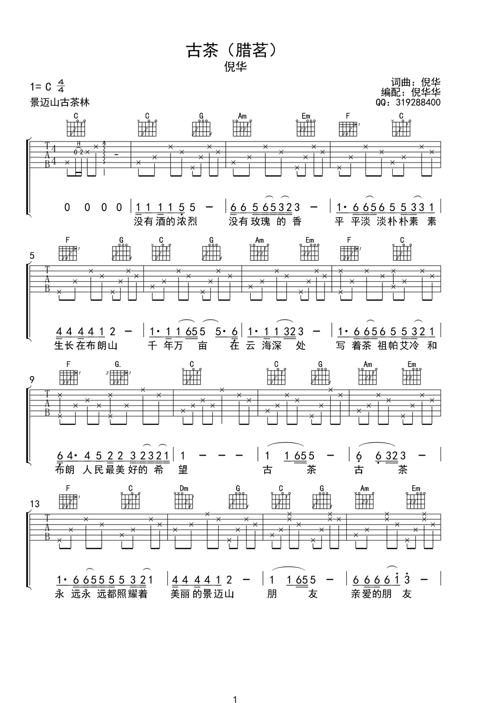 曲谱介绍: 古茶腊茗《古茶腊茗_》吉他弹唱谱,共有2张高清图谱,免翻页排版设计。