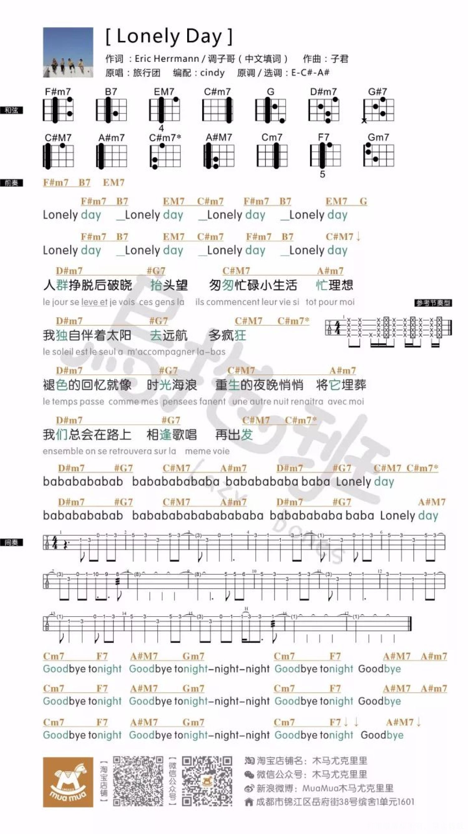 曲谱介绍: 旅行团乐队,1999年成立于广西柳州市,2005年签约摩登天空后改名旅行团乐队(The LifeJourney)。成员有孔阳、黄子君、韦伟、朱筱毅、徐彪。乐队风格:Indie Rock,Indie Pop,Britpop,Pop-Rock。乐队创作将音乐更生活化、更真实更丰富更情绪化,因而作品相对多元化。Life is journey, Journey is life(生活即旅行 , 旅行即生活) 旅行团乐队首张专辑《来福胶泥》所收录歌曲,正如乐队名字那样,在创作上极尽浪漫。专辑名称“来福胶泥”,实际上是乐队英文名字“Life journey”的音译,仅从这名字,就可以闻到旅行团音乐中的乡土气息。实际上,旅行团乐队是目前内地少有的清新乐队,音乐时髦,形象健康,毫无造作。与包装出来的乐队或组合不同,旅行团的受追捧完全是靠一场场精彩的演出赢得的,而喜欢旅行团的乐迷虽然仍属小众,但却大多素质很高,不是盲目迷恋男色的冲动者。   《Lonely Day》 旅行团本团说,自己唱的是。。。   对会法语的人表示深深敬畏 旅行团说:列侬对我们影响很大,我们是听着披头士长大的,孔阳还画了很多关于他的画像,这是其中一张。北京每年都有小型纪念音乐会,我们参加过2次,第一次是就是在06年12月9号,我们唱了挪威森林、纵横宇宙,也就在那天凌晨,我们写下了Lonely Day。这是小P第一次跟我们演出,之后他就入伙了。   来听听我们的翻唱吧 Ukulele:Cindy 吉他:调子哥   尤克里里谱 喜欢吉他的小可爱们 给你们准备了旅行团自己出的 原版吉他和弦谱