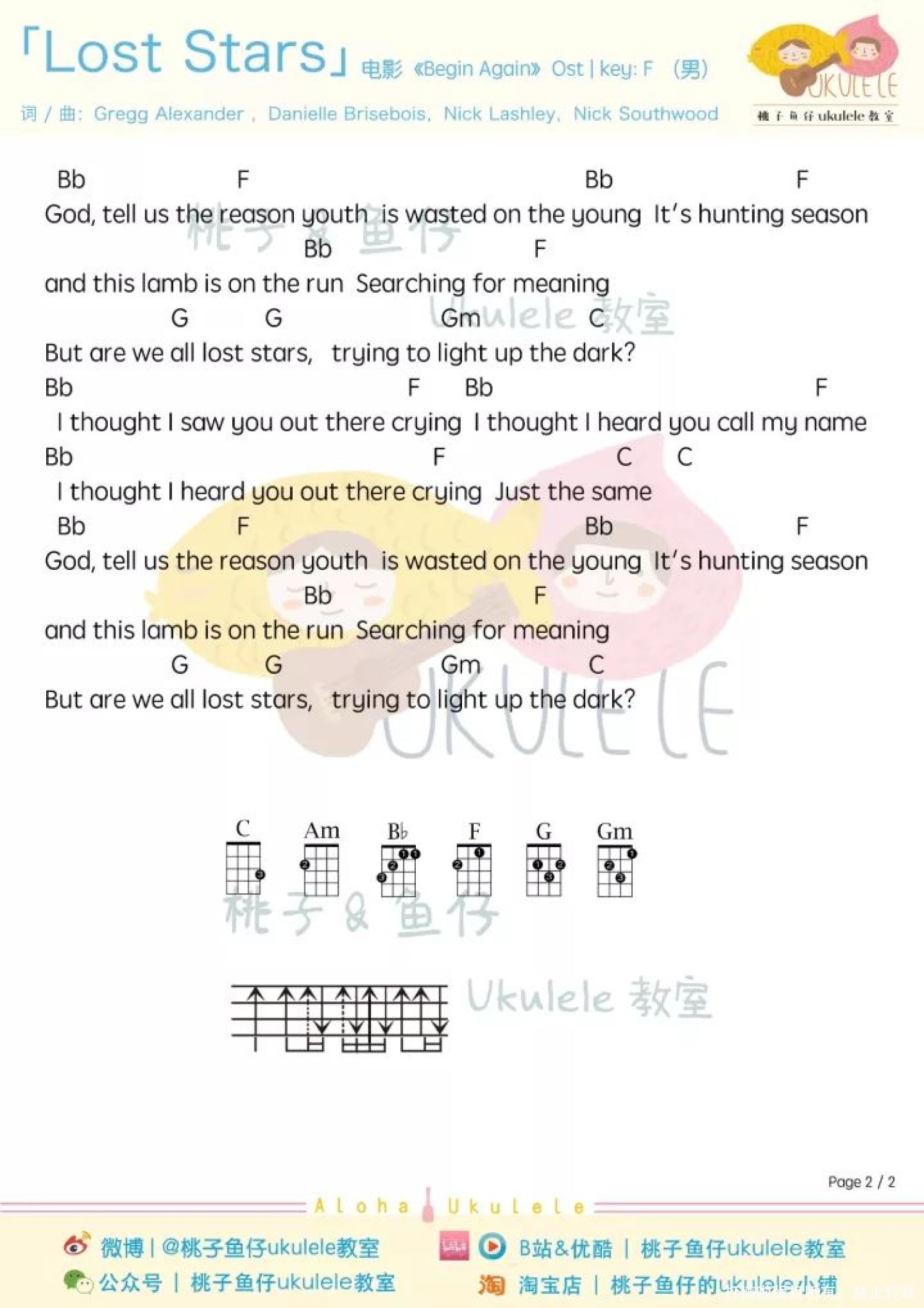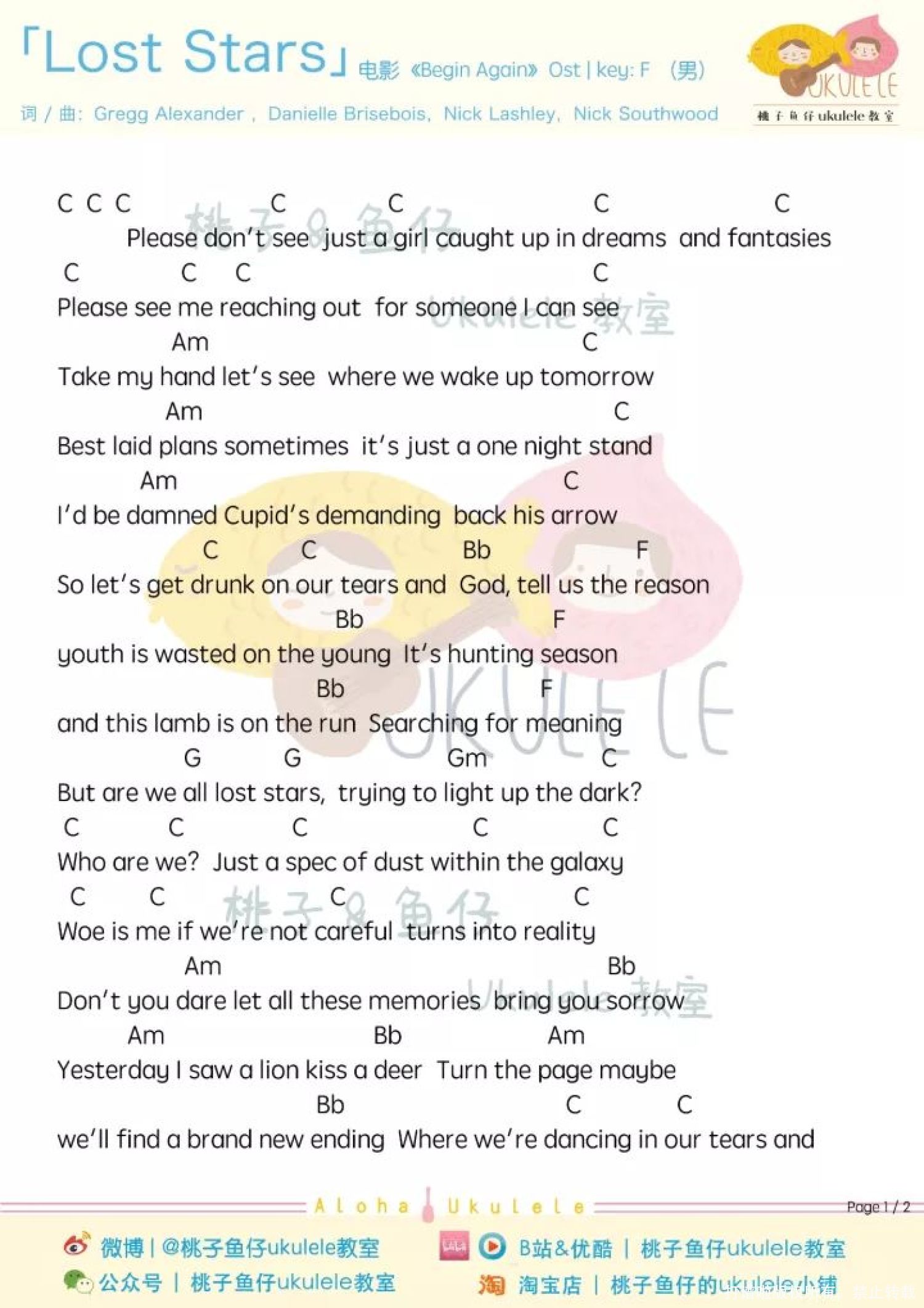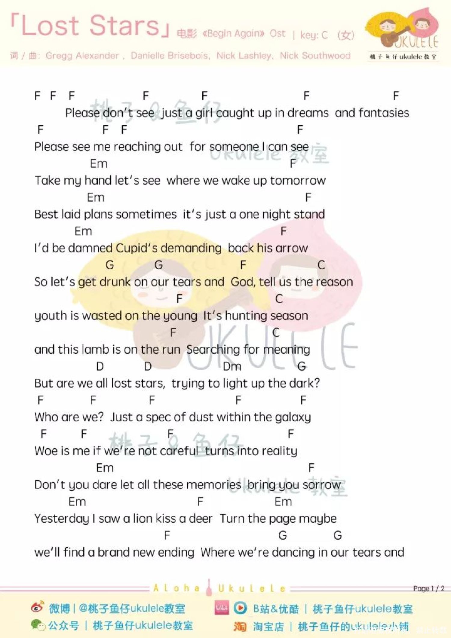 曲谱介绍: 一部好听的电影 ▌「Begin Again」—(译为《歌曲改变人生》、《再次出发之纽约遇见你》)是由美国韦恩斯坦国际影业公司发行,由约翰·卡尼执导,凯拉·奈特莉、马克·鲁法洛、亚当·李维等联合主演的爱情音乐片。 ▌这部影片是大受影迷喜爱的《Once曾经》导演约翰·卡尼自编自导新作,这是一部讲述爱情,失落以及动人音乐的影片。 格蕾塔跟随音乐家男友戴夫来到美国,在这里戴夫有着更好的事业机会,孰料戴夫来到纽约不久就开始劈腿,令格蕾塔伤心欲绝。失去了爱情,格蕾塔在偌大的陌生城市里找不到方向……  电影的歌曲们都很好听,整部电影好像有一缕阳光照射下来的感觉,明朗轻快的节奏,温暖治愈的故事,生活需要点调味剂来改变,而音乐就让生活变得更美好。阳光满满,一切充满了新的希望。 【Lost Stars】 ● Greta说送不起很贵的东西给自己深爱的前男友,就弹唱了这首《Lost Stars》当礼物送给Dave,透过美好的旋律,两人的甜蜜满溢其中。因为那时候她觉得他就是她最珍贵的星辰,为她照亮黑暗。没想到曾经幻想过的美好一切化作泡影,流行音乐的市场,对成名的渴望,Dave爱上了别人,在名利的漩涡中迷失了自己。 ● Dave回到纽约,请求Greta听他的演唱会。她要求他不要用流行的浮夸诠释属于他们的歌。 那个晚上,他在台上流着泪唱,她在台下流着泪听,在《Lost Stars》唱到高潮部分,她转身走出了演唱会现场。因为她明白,台下那些疯狂的歌迷才是这个时刻Dave最需要的。   Lost Stars尤克里里弹唱教学   「Lost Stars」尤克里里谱 女声版 男声版
