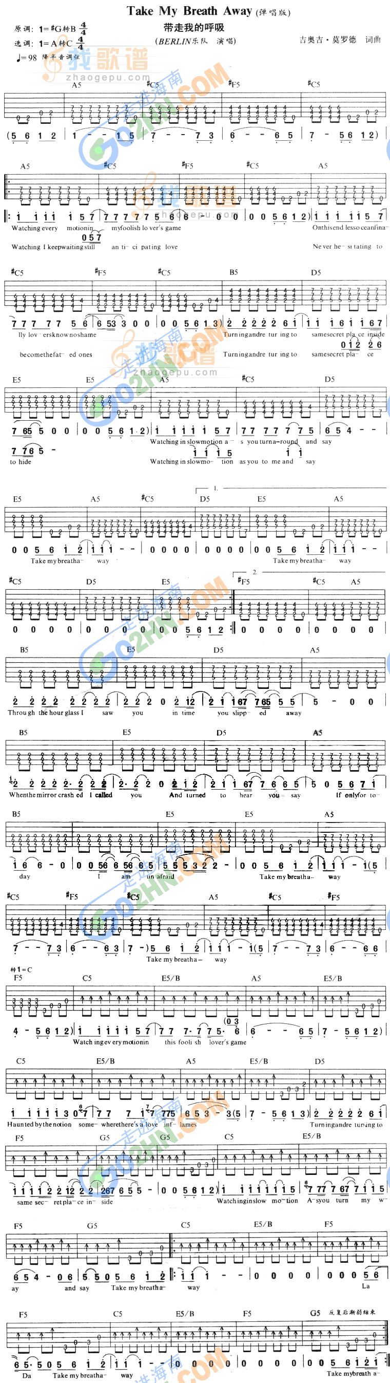带走我的呼吸吉他谱 - berlin乐队 - A调吉他弹唱谱