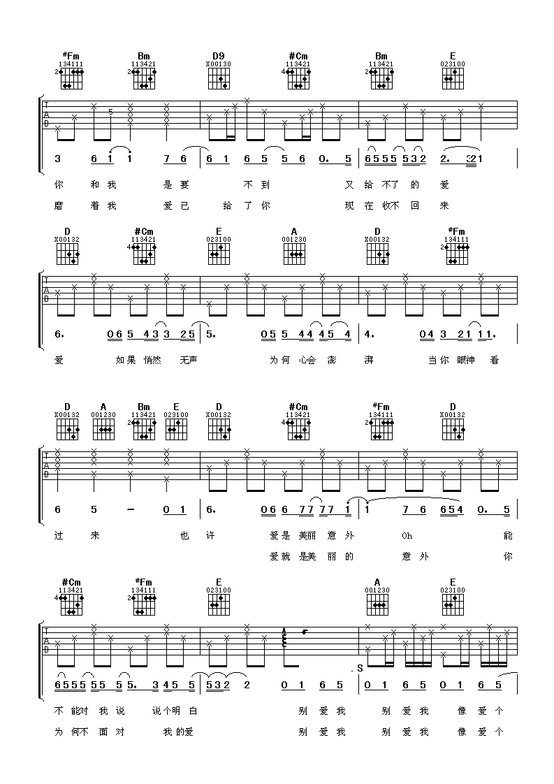 曲谱介绍: 别爱我像爱个朋友吉他谱采用了A调指法,由阿潘音乐工场编配完成。除了这首谱以外,推开世界的门吉他谱也非常不错,速度去围观一下吧!