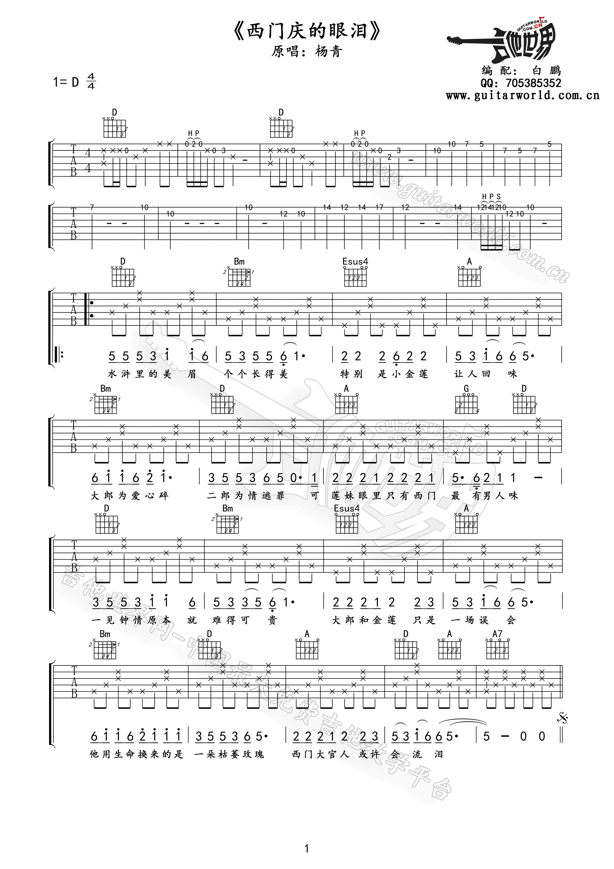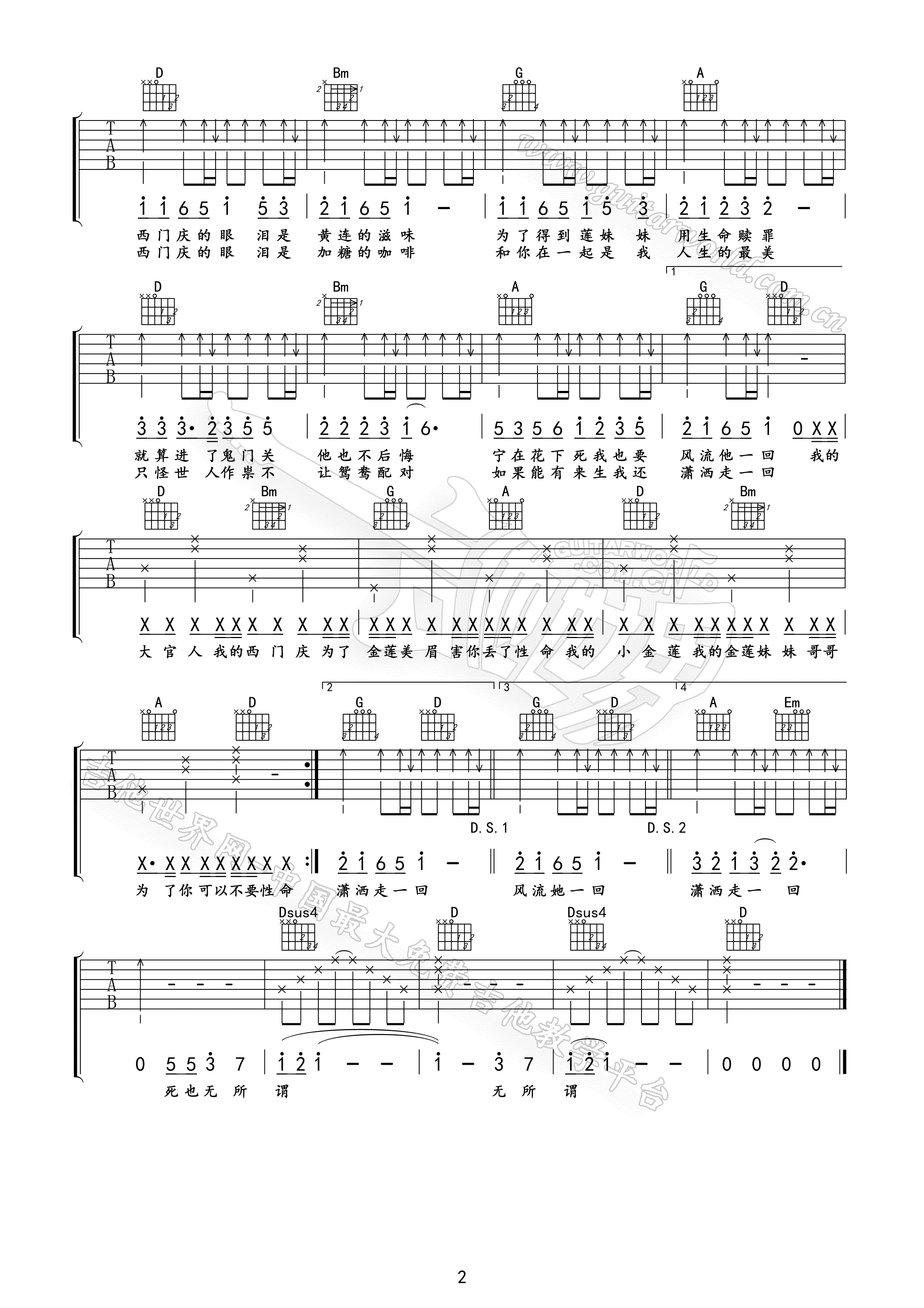西门庆的眼泪吉他谱 - 杨青 - D调吉他弹唱谱