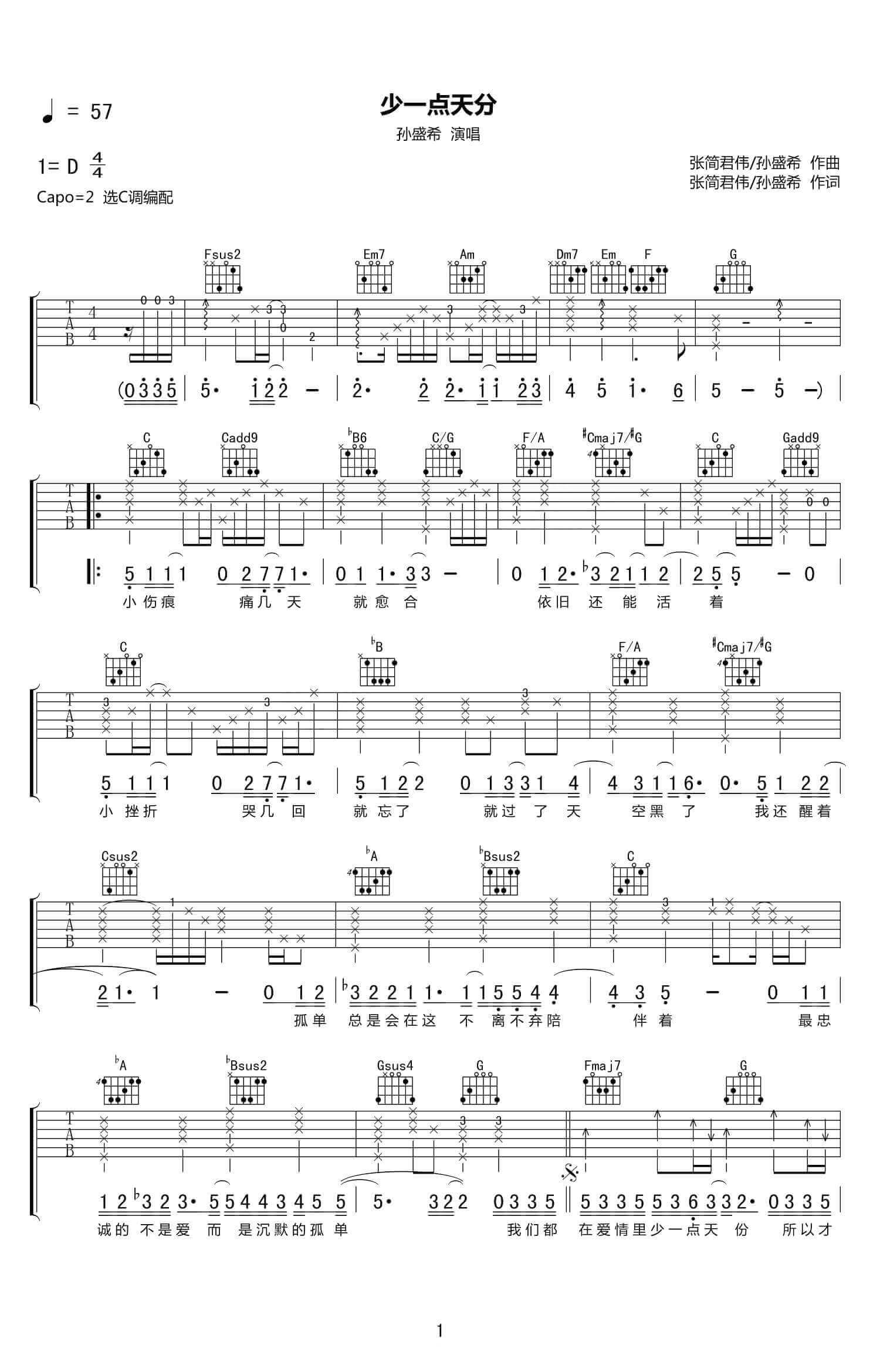 曲谱介绍: 少一点天分吉他谱原曲采用D调编配,这个转载的版本是采用C调,简单动听。这首歌是孙盛希唱的,并作为TVBS偶像剧《俏摩女抢头婚》的片尾曲。整首歌是伤感的基调。前奏一出来就把我带进了悲伤的情绪中,很适合失恋的人听。