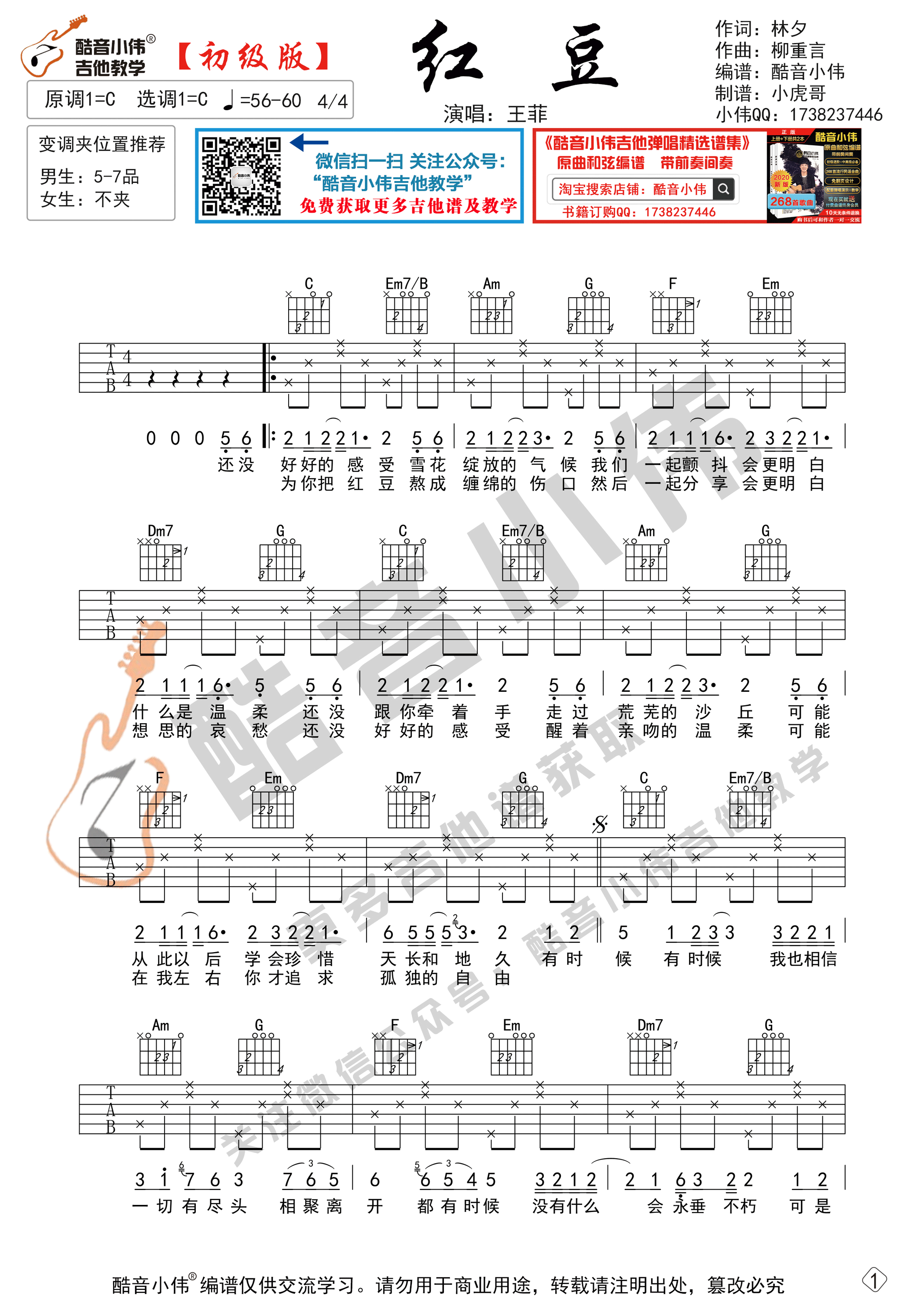 曲谱介绍: 曲谱适合初学者弹奏,选用C调指法,变调夹的位子可以根据我的推荐来选择。使用8分音符分解伴奏型弹奏。先弹奏会曲谱,再清唱会,然后弹唱结合一起练习。《红豆》是王菲演唱的一首歌曲,《红豆》的流行除了旋律的动听之外,林夕细腻、缠绵的笔锋也为歌曲增色不小;而王菲的声音听起来有些弥散,但是形散而神不散,特别是中间饱含的情感,流露自然,不愧为一首情歌的典范 。