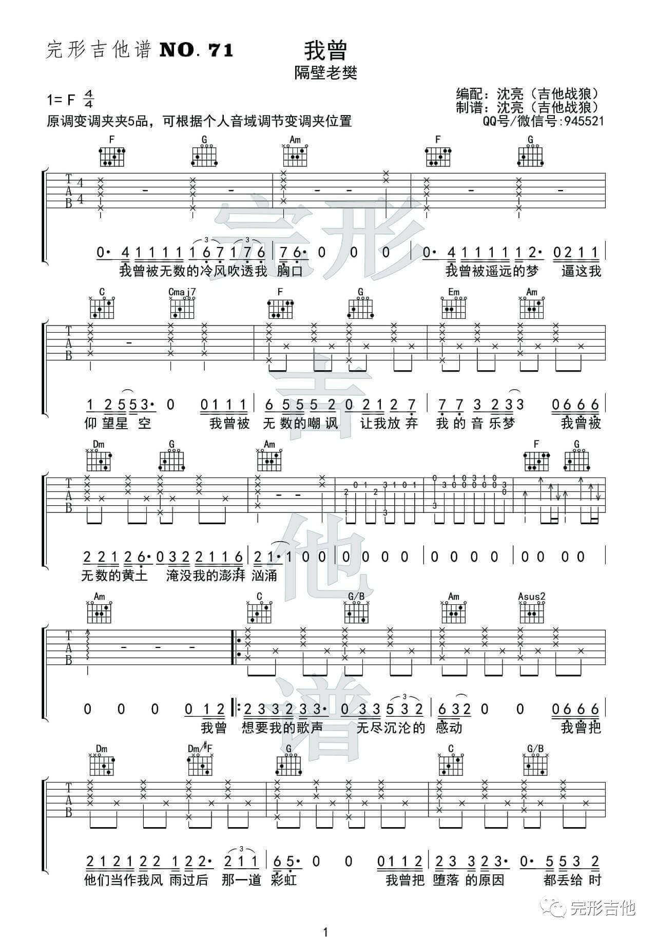 我曾吉他谱 - 隔壁老樊 - F调吉他弹唱谱