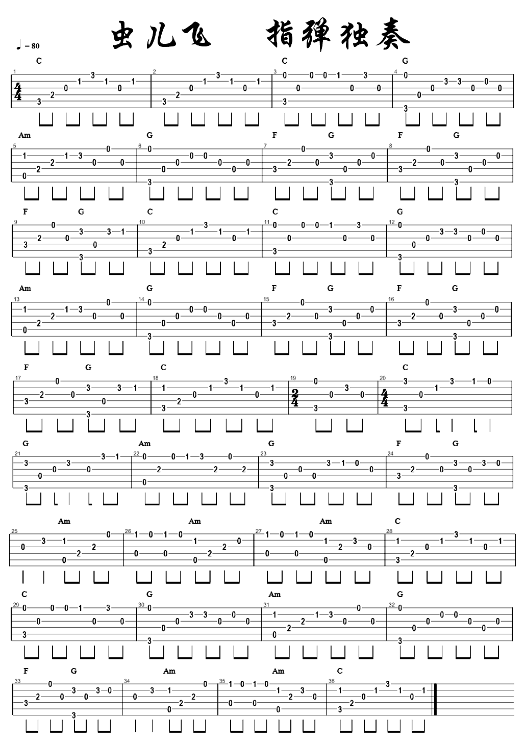 曲谱介绍: 虫儿飞指弹谱采用了C调指法编配完成。这首《虫儿飞》给人一种安静的力量,听着能让人慢慢沉思。 吉他弹唱演示及视频教学