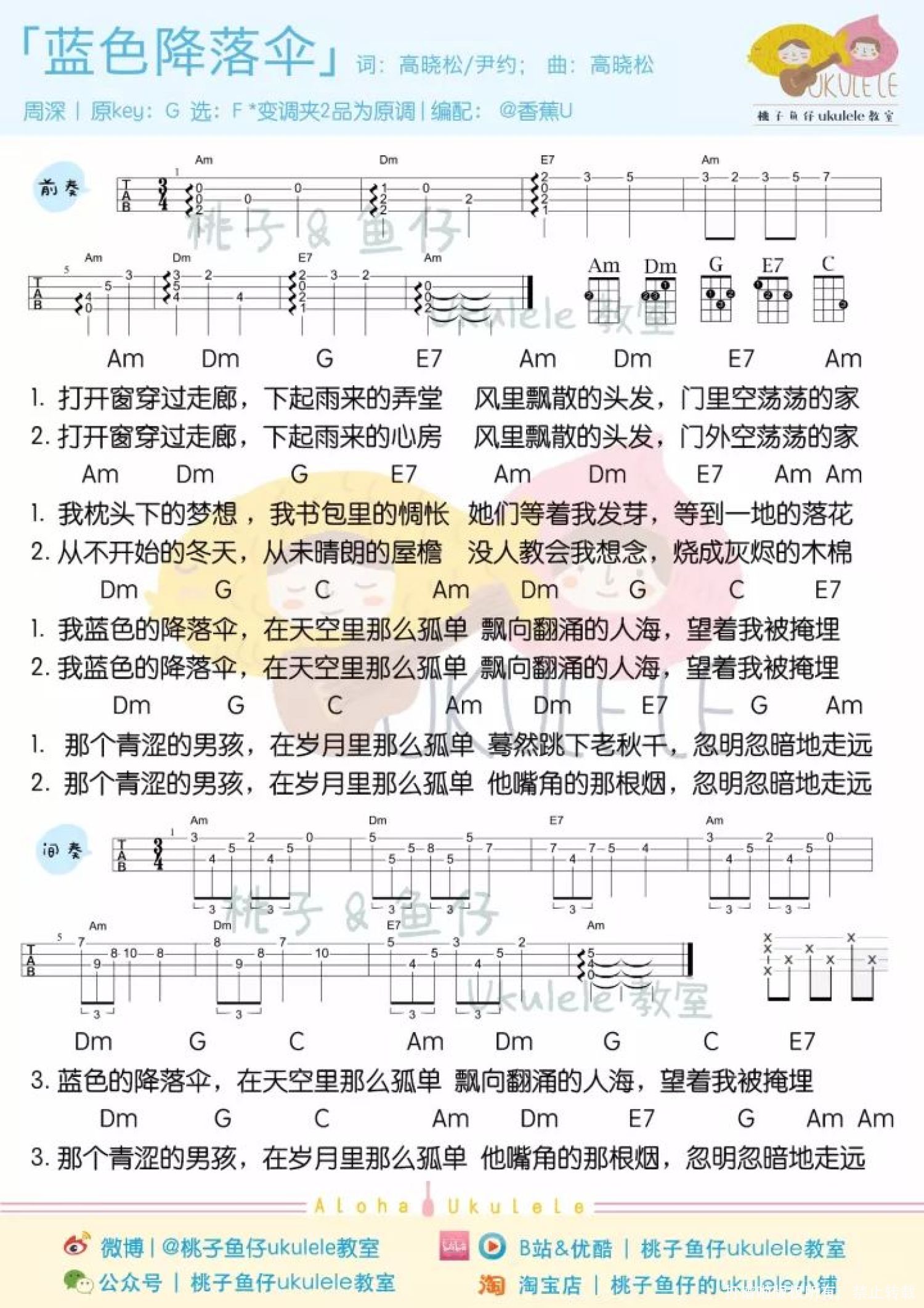 曲谱介绍: ● “打开窗穿过走廊,下起雨来的弄堂。”一开篇仿佛一段细碎的脚步声,沿着歌词和声音的脉络,我们来到这首歌的维度。“我枕头下的梦想,我书包里的惆怅。她们等着我发芽,等到一地的落花。”这世间就像孤独也是可以赋予美,赋予种种颜色,太多人尽管一生再黯淡,平庸的岁月再漫长,也总会期待那么一瞬间,那如蓝色降落伞打开飘荡闪出的光芒,就足以将生命照亮。 ● 歌曲编曲配置也是集合了中美两国非常优秀的团队参与。其中古典吉他和弦乐的对话如泣如诉,古典吉他solo的部分刘泷俊的演奏更是打动人心。这首歌的部分创作灵感也来源于顾长卫导演的经典电影《孔雀》。剧情中姐姐拖着自制的蓝色降落伞,在那吵吵闹闹的街市中穿行的一个片断,却是整部影片的华彩乐章,也是导演在这部分作品中再也压抑不住的激情迸发。 ● “我蓝色的降落伞,在天空里那么孤单。飘向翻涌的人海,望着我被掩埋”。于时代而言,人就如飘零于沧海之浮木,裴多菲说过的,绝望之为虚妄,正与希望相同。也许命运总是被左右,但幸好我们还有这么一首歌。   尤克里里弹唱谱