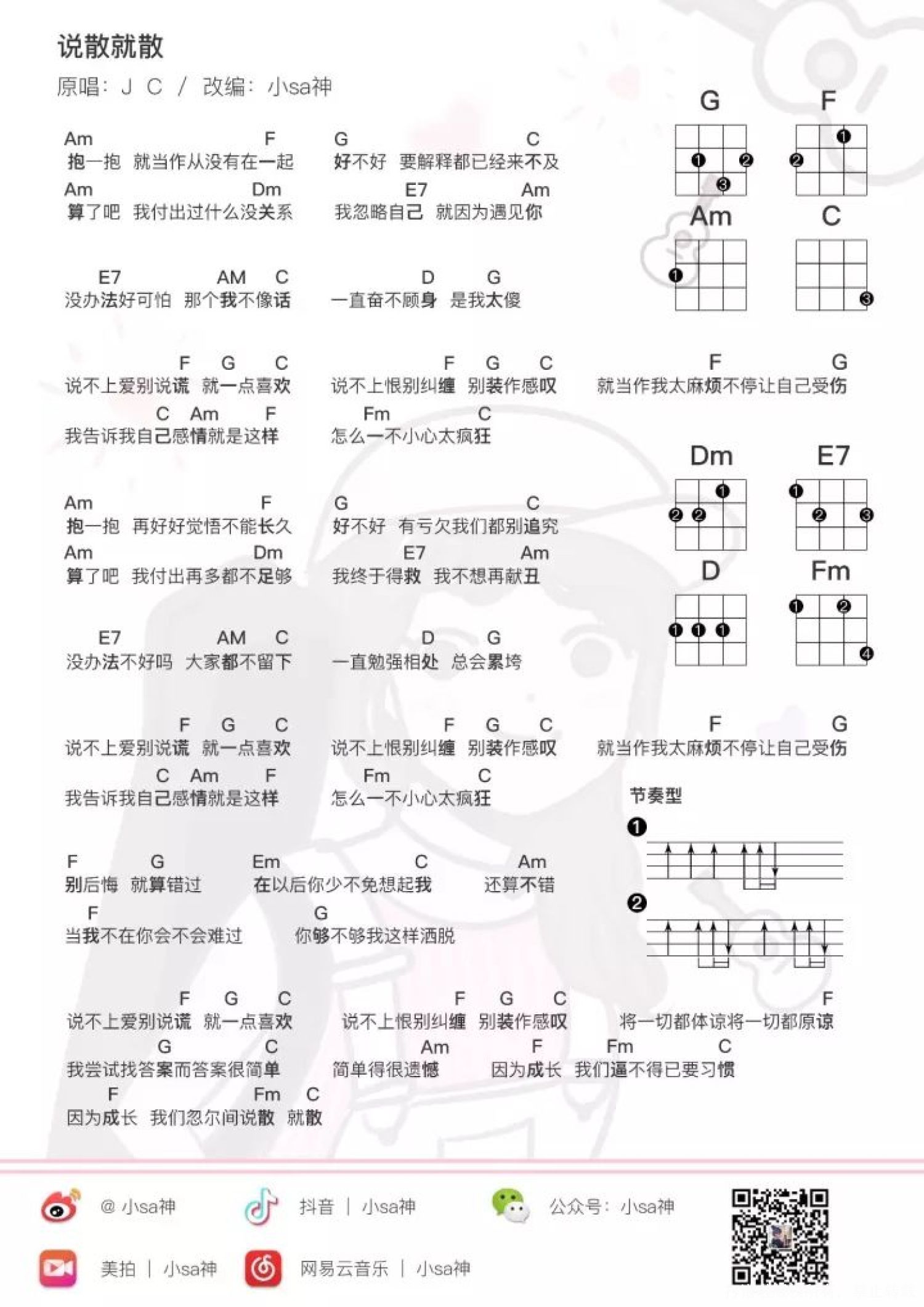 曲谱介绍: 说不上爱别说谎 就一点喜欢 说不上恨别纠缠 别装作感叹 ▼ 呐,请欣赏肉sa的弹唱现场版,说胖就胖。 (好像不适合露脸唱悲情的歌,很多童鞋留言说走心了,但我自己不敢看这个视频……整个表情都很垮掉,伤)     以下就是这首歌的教程,和弦用的比较多,有些跨度大的比如Fm和E7都需要多多练习。你sa在视频里介绍了如果轻松地从F换到Fm,加油加油! 结尾用到了一次Em,我没有po出来,大家快低头看一眼和弦Tee!   说散就散 尤克里里谱