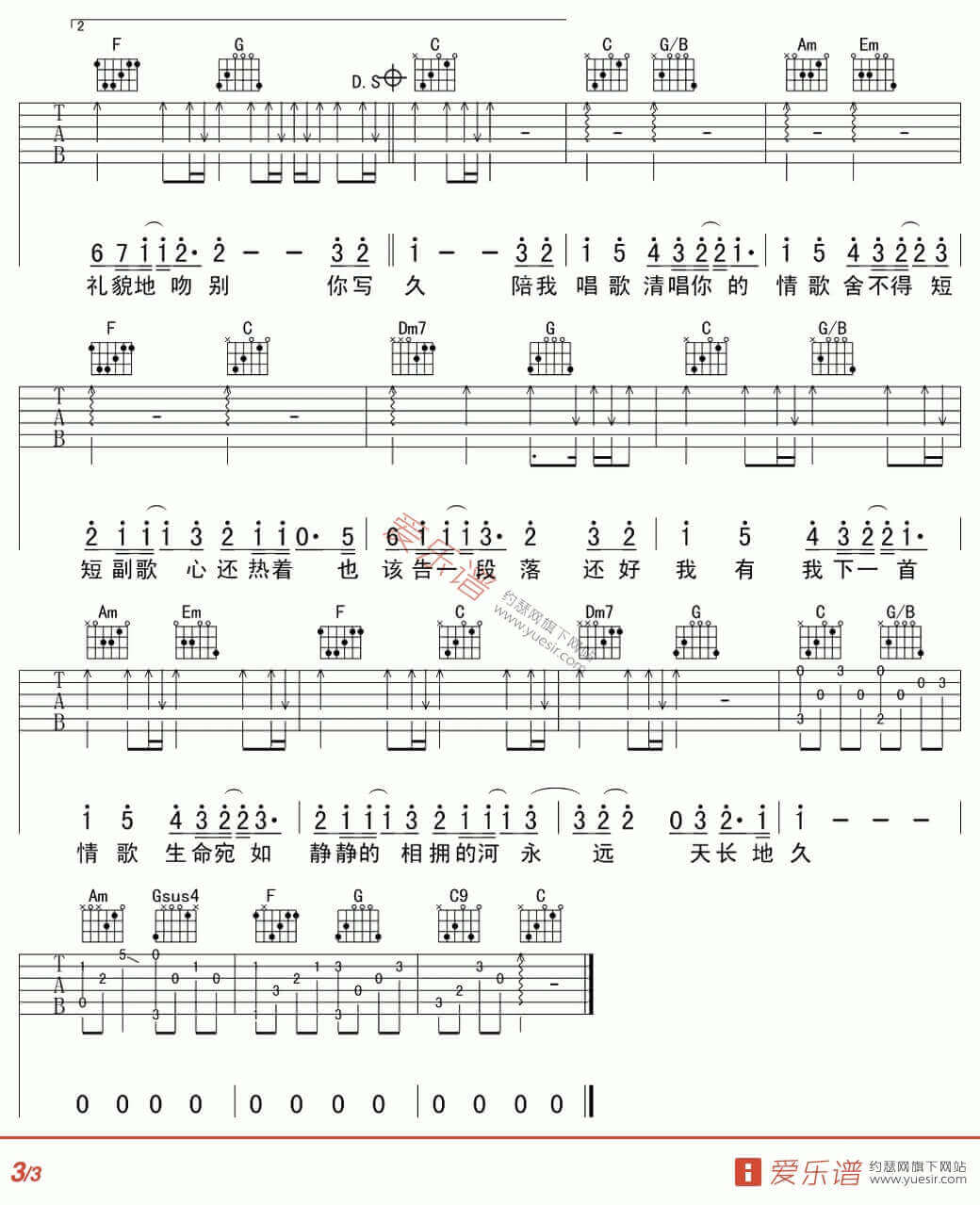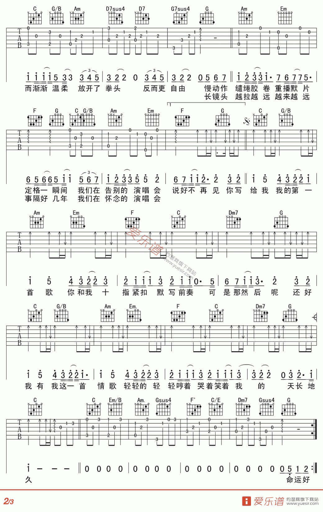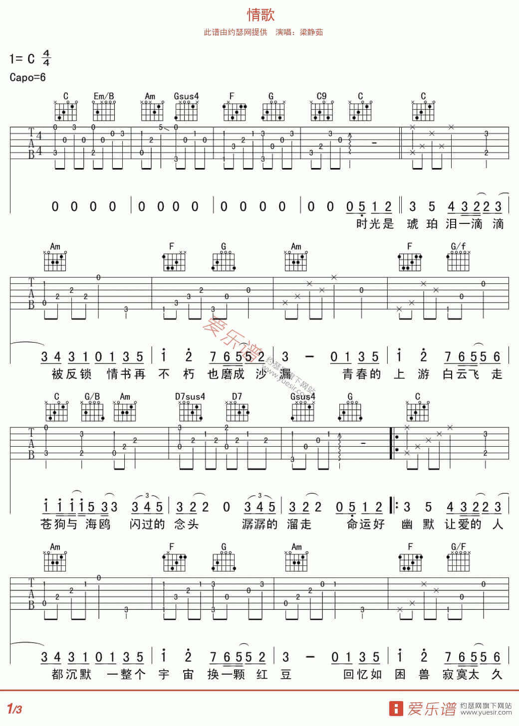 曲谱介绍: 情歌吉他谱采用了C调指法编配完成。